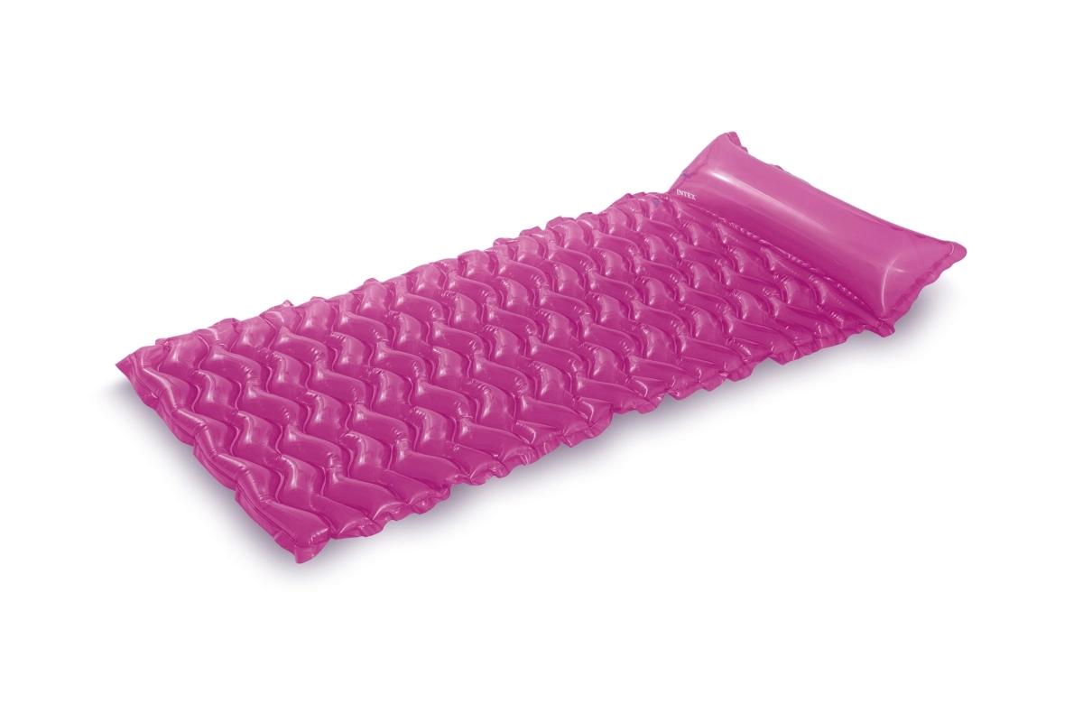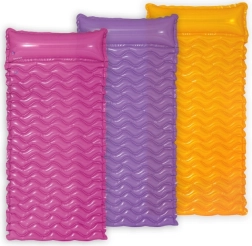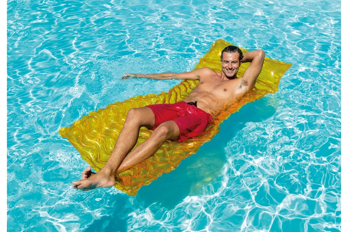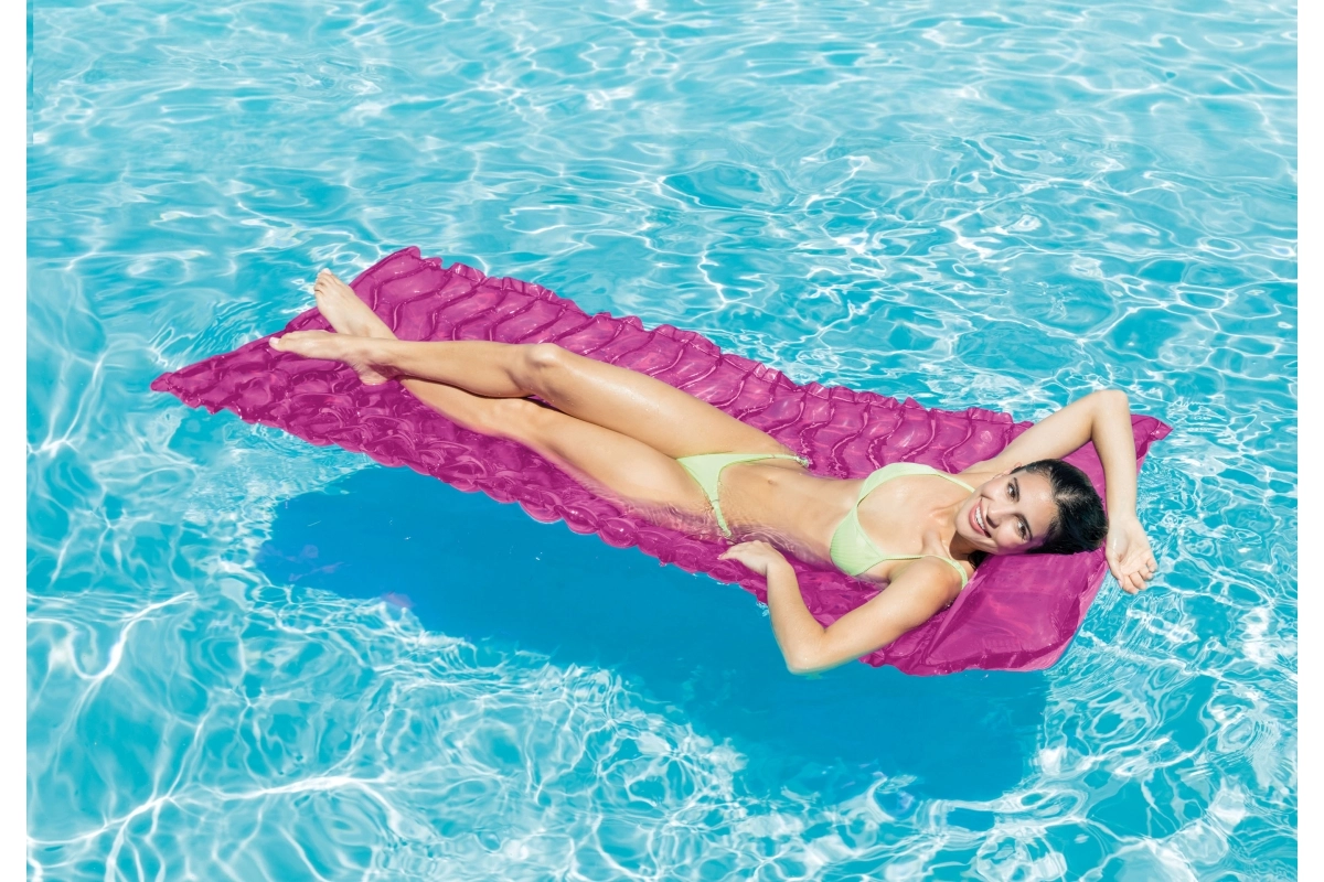 Надуваемата постелка с вълнообразен дизайн е идеална за релакс до басейна и за почивка край вода. Широката площ гарантира удобно лежане, интегрираната възглавница поддържа врата и главата, а качественият винил издържа на летните забавления. Конструкцията с две камери осигурява по-висока безопасност и стабилност на повърхността.