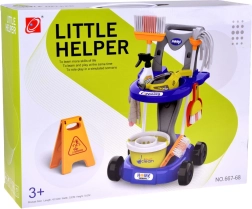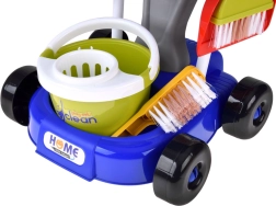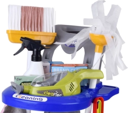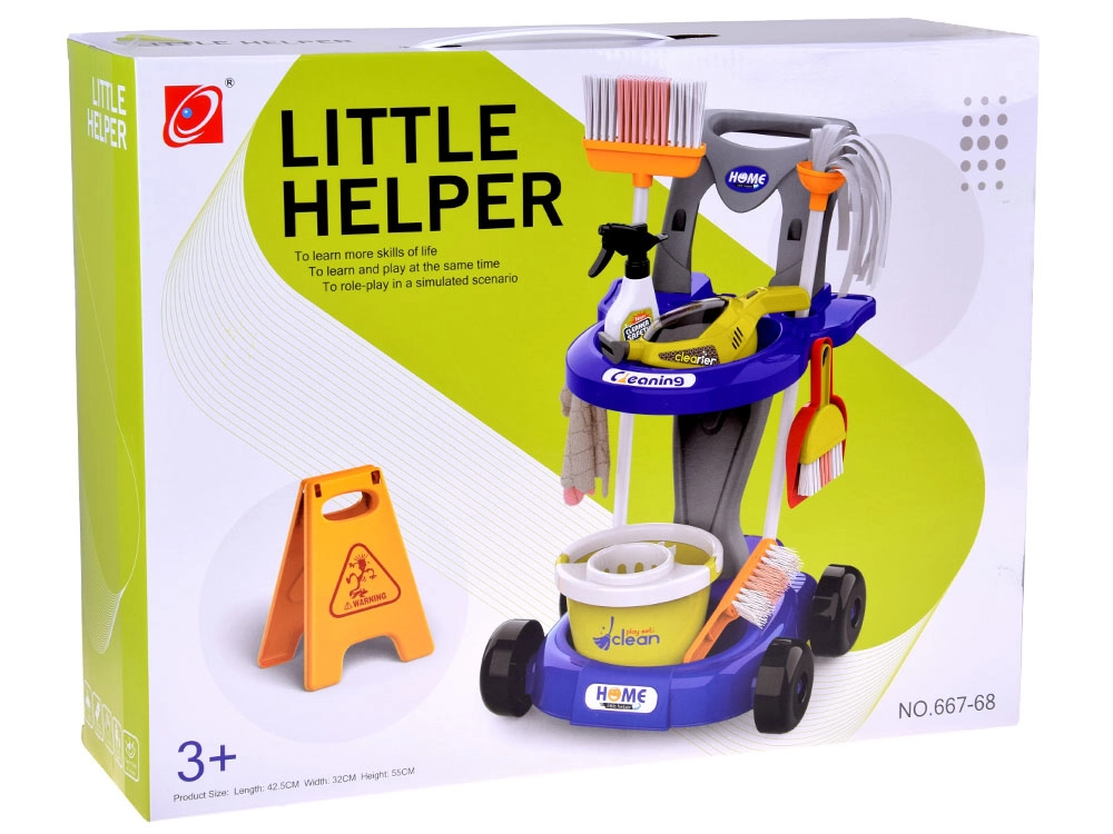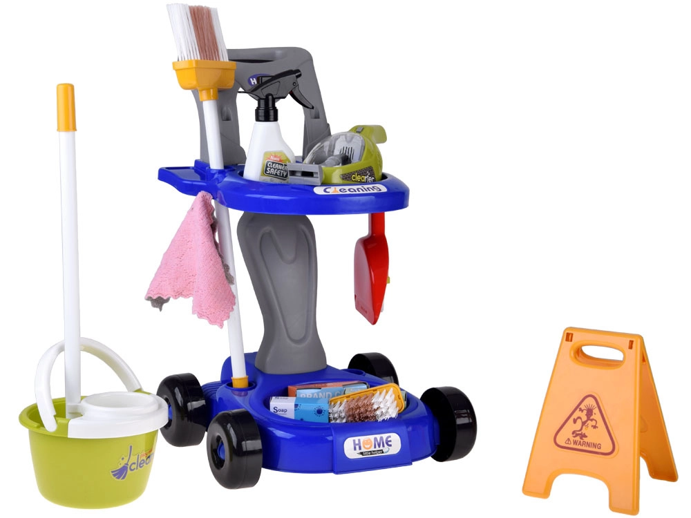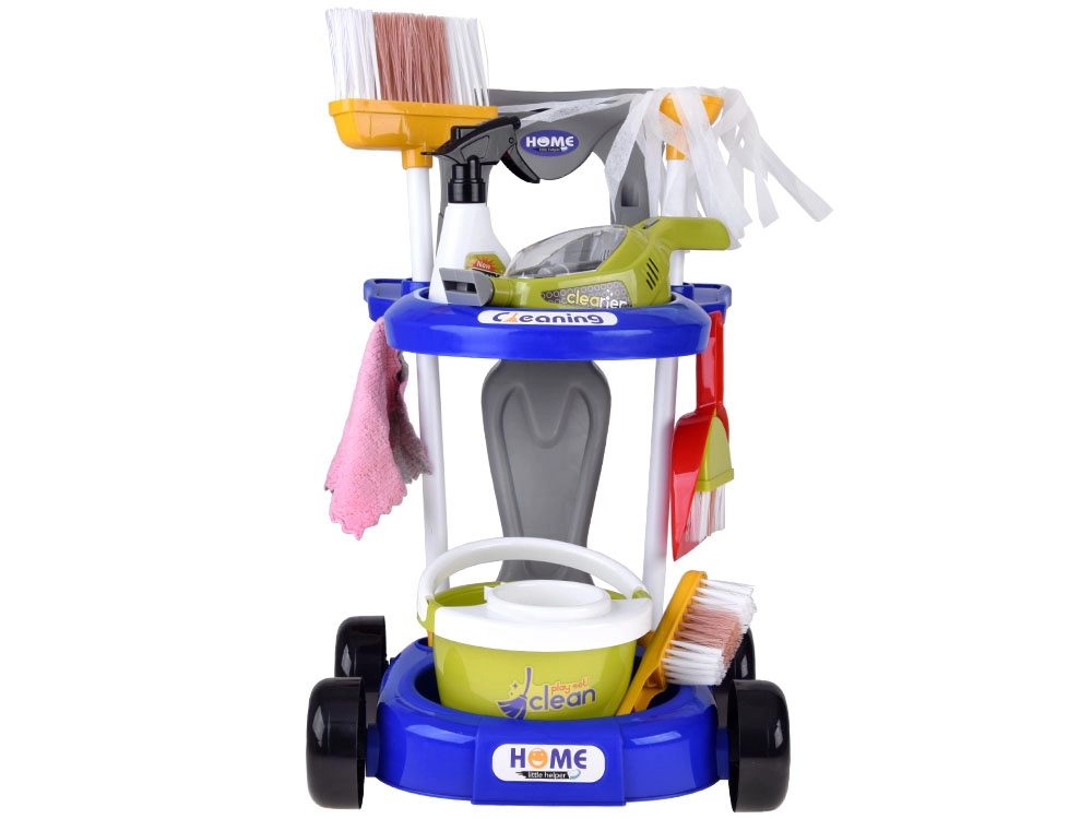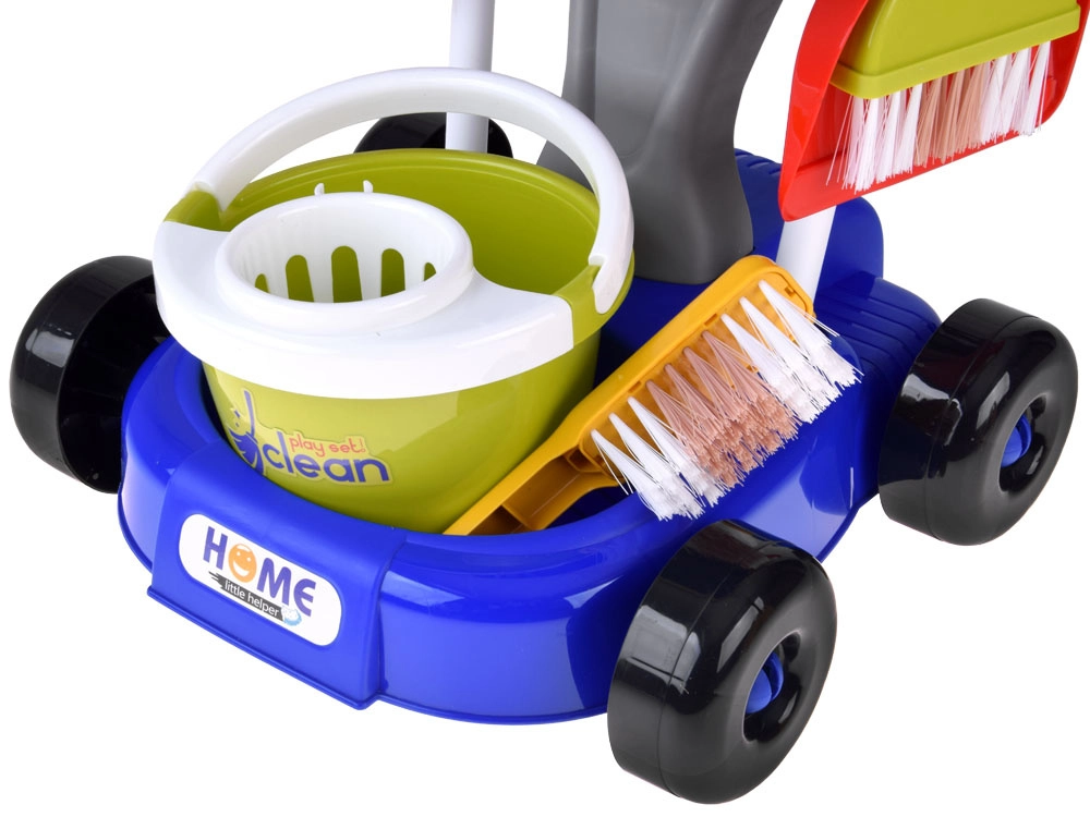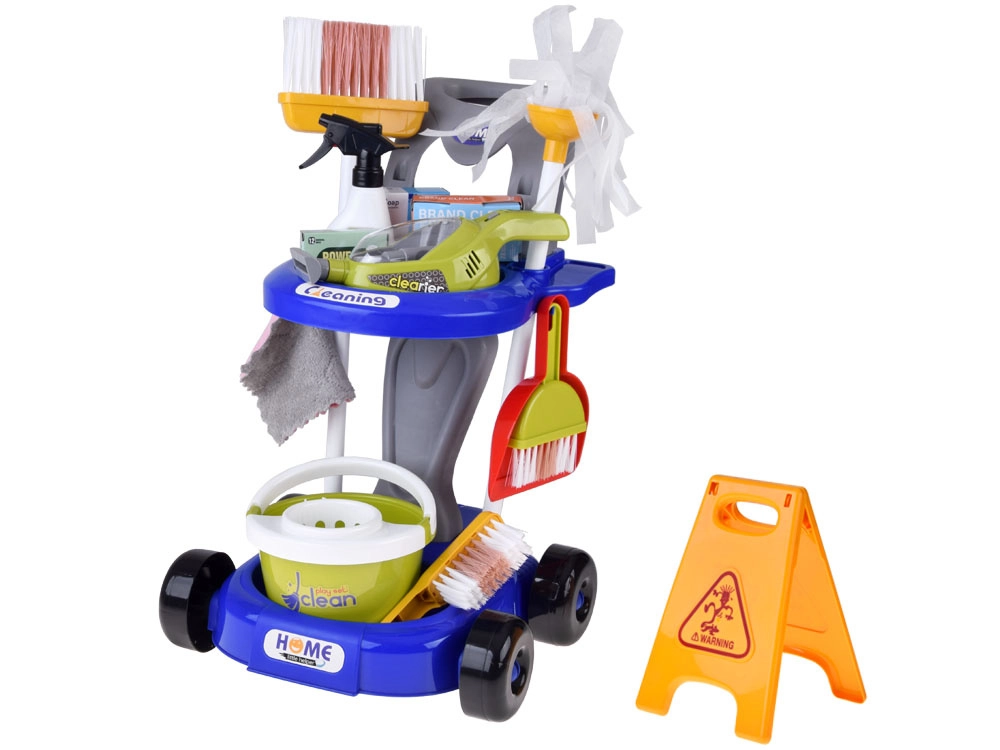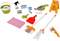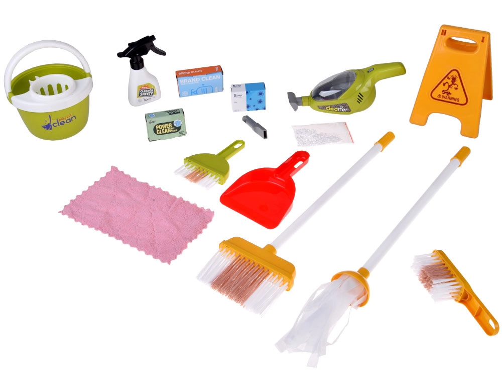 Моп, метла, ръчен метличка и лопатка, кофа с преса, кърпичка, пръскалка, предупредителна табела и кутийки – всичко, което децата имат нужда, за да имитират домашни дейности.