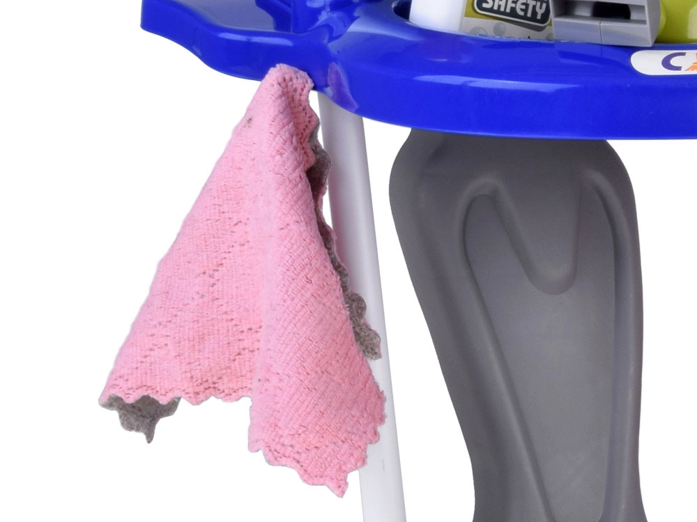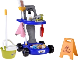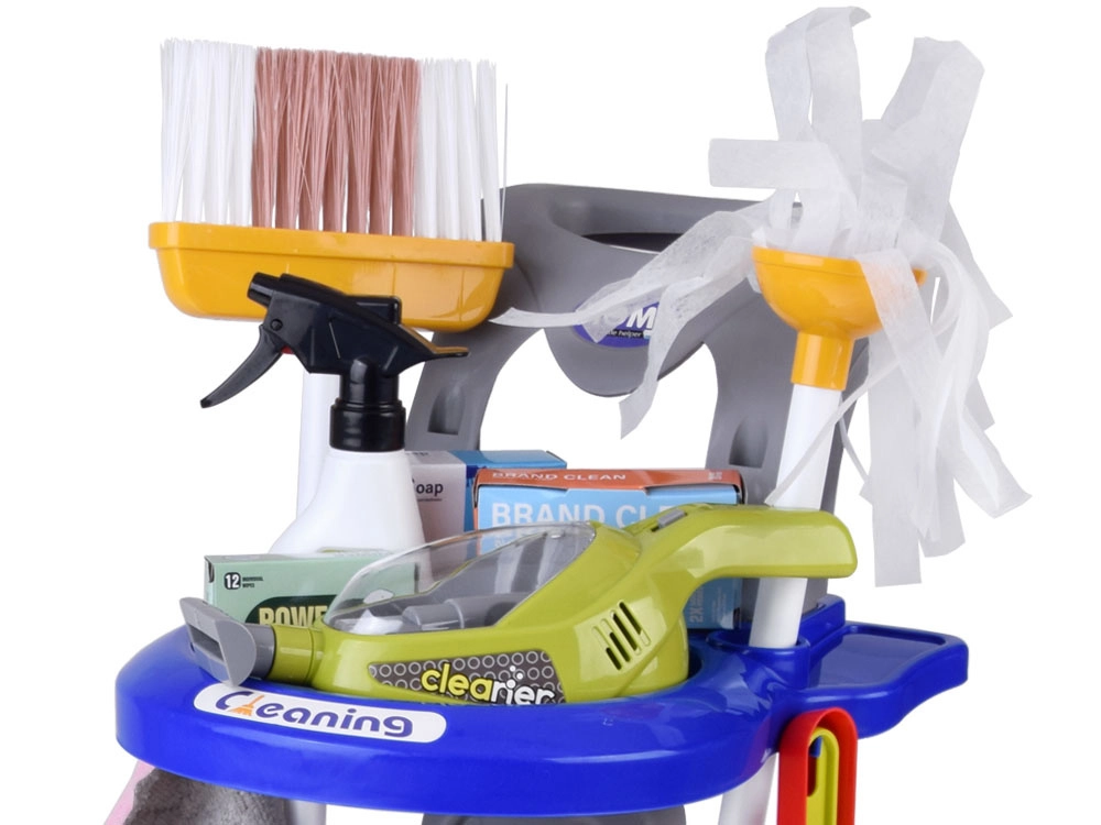 Подарете на децата реалистично забавление с количка за почистване, пълна с аксесоари. Комплектът съдържа моп, метла, ръчна метличка със стъргалка, кофа с преса, кърпичка, пръскалка, предупредителна табела, картонени кутийки и играчка-прахосмукачка със сменяеми накрайници и топчета за „изсмукване“. Така децата безопасно имитират ежедневните дейности на възрастните и се учат колко е важно да се поддържа ред.