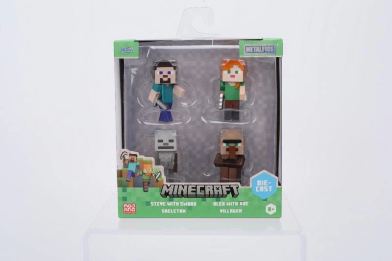 В опаковката ще намерите четири любими персонажа: Steve с меч, Alex с брадва, Skeleton и Villager. Благодарение на компактната височина от 6 см фигурките са чудесни за бюро, рафт или витрина.