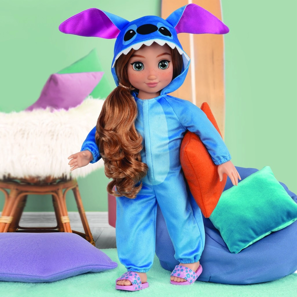 Очарователна кукла, вдъхновена от героя Stitch на Disney, висока около 45 см, с дълга разресваща се коса и подвижни крайници. Стилен син гащеризон с цип и качулка с ушички насърчава креативната игра, преобличане и позиране. Страхотна приятелка за гушкане, стилизиране и ежедневни приключения.