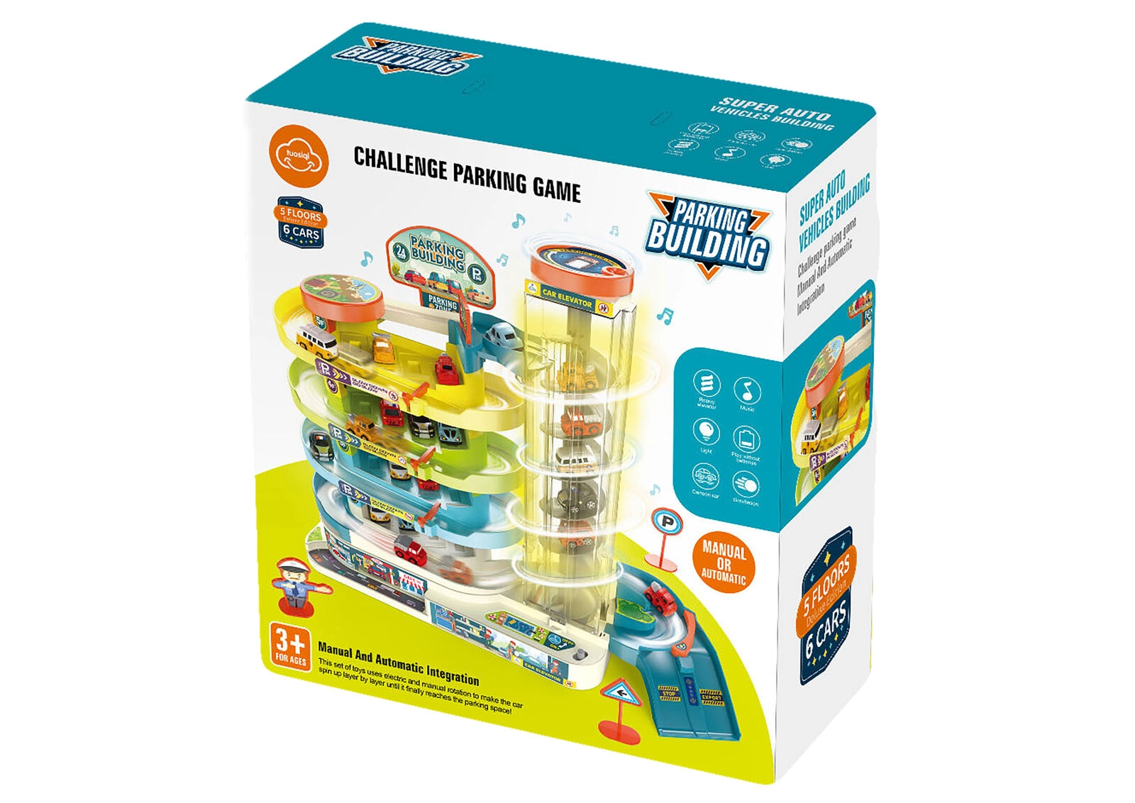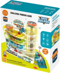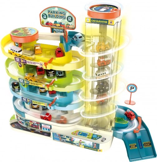 Този многоетажен гараж носи на децата часове креативно забавление. Работещият асансьор може да се използва с батерии или ръчно (превключвател), така че децата да изберат своя начин на игра. Светлинните и звуковите ефекти придават още по-голяма автентичност на паркирането и преместването на колите.