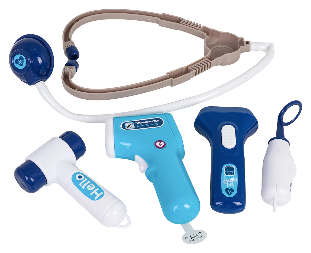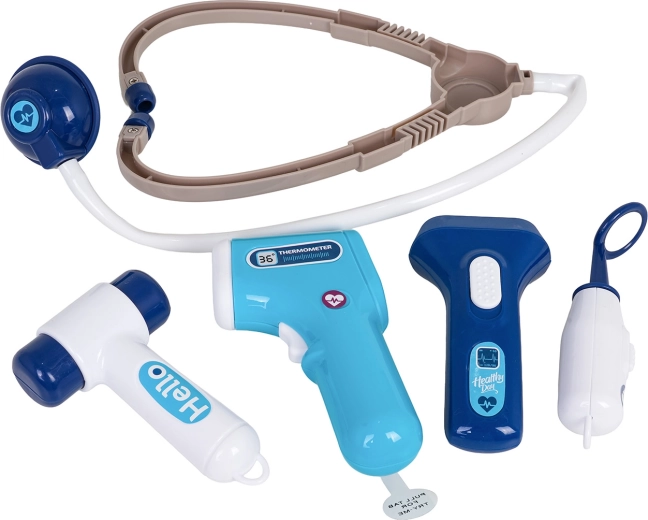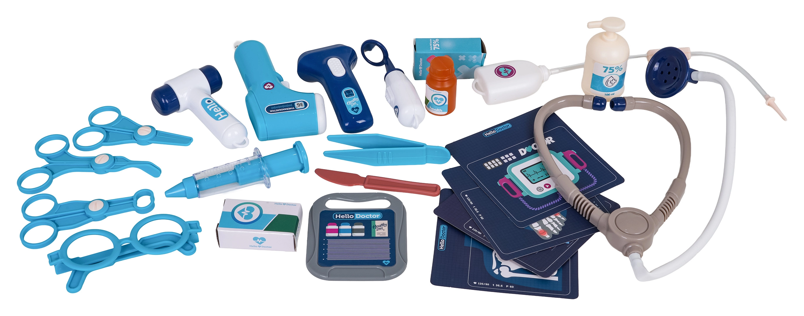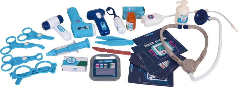 Стетоскоп, безконтактен термометър със светлина, спринцовка, ножици, пинсета, огледалце, чукче, очила, карта на пациента и други аксесоари за креативна игра.