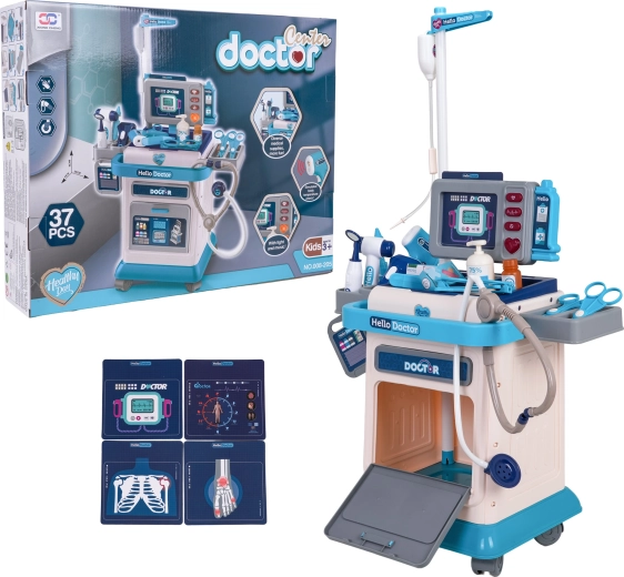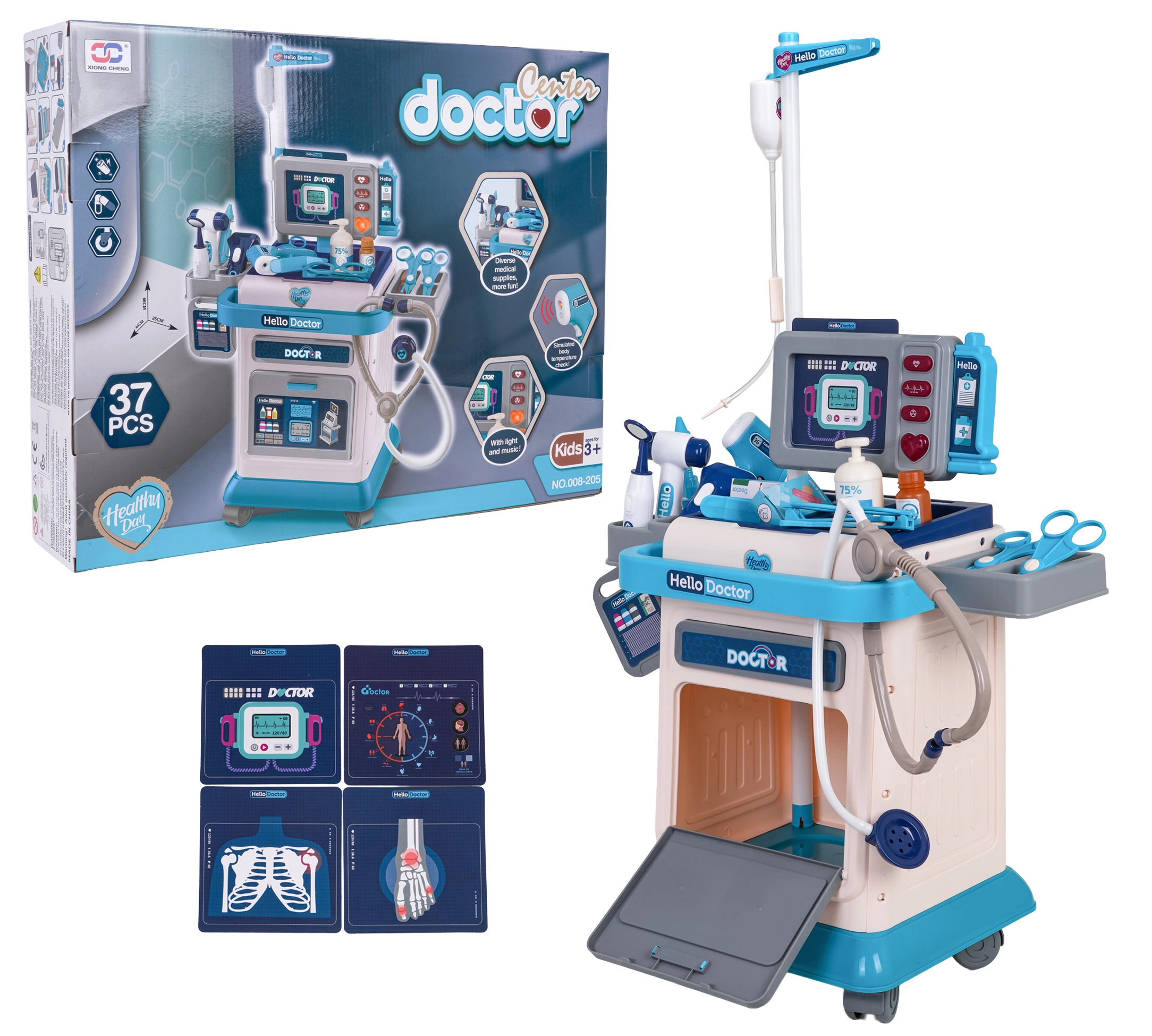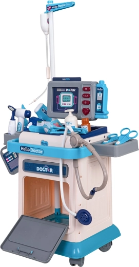 Този богато оборудван лекарски комплект за деца предлага забавна и поучителна игра на лекар. Стабилната количка на колелца с регулируема дръжка улеснява преместването на цялата „ординaция“, докато панелът на монитора предлага светлинни и звукови ефекти – сърдечен ритъм, измерване на температура, звук от томограф и аларма. В комплекта има сменяеми снимки за ЕКГ и томограф, които подпомагат реалистичната игра.
