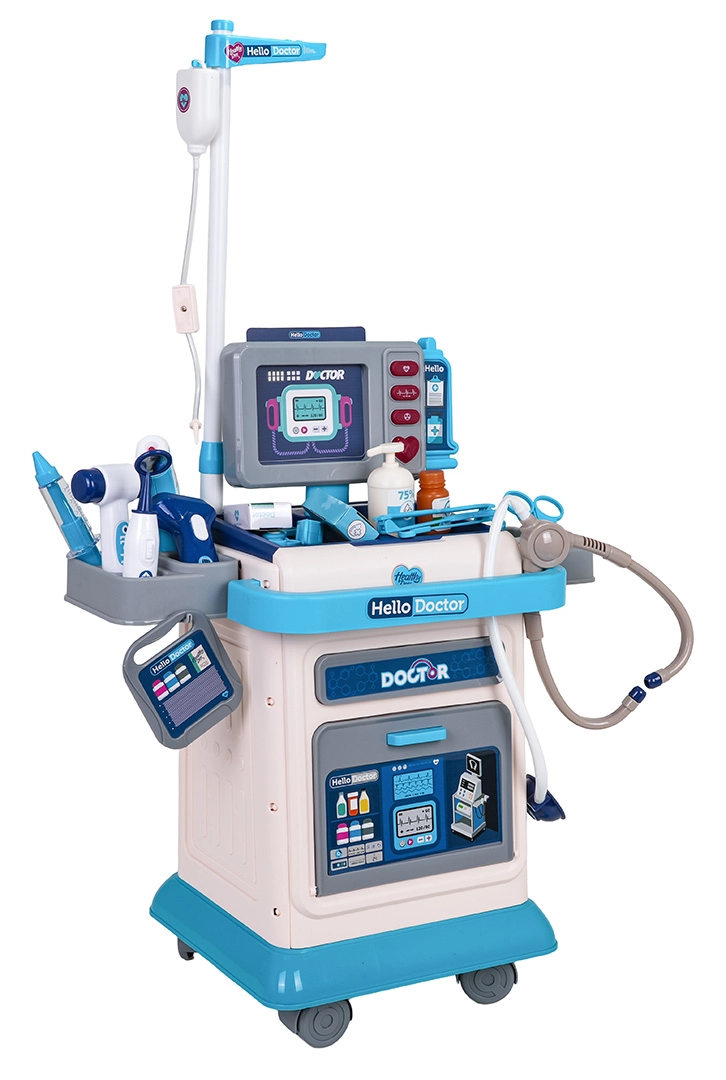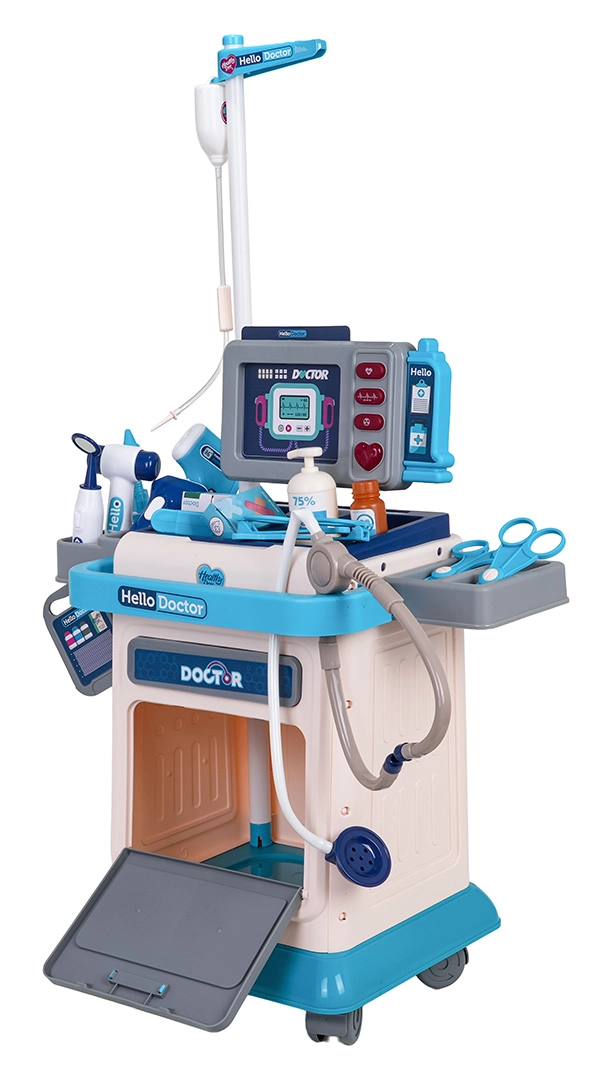 Децата ще намерят в комплекта всичко необходимо: стетоскоп, безконтактен термометър със светлина, спринцовка, ножици, пинсета, огледалце, неврологично чукче, очила, както и дребни аксесоари като карта на пациента, шишенце с „дезинфекция“, кутийка с лепенки и лекарства и IV стойка. Количката има практично чекмедже и държачи за подредено съхранение на инструментите.