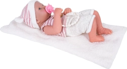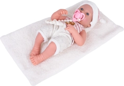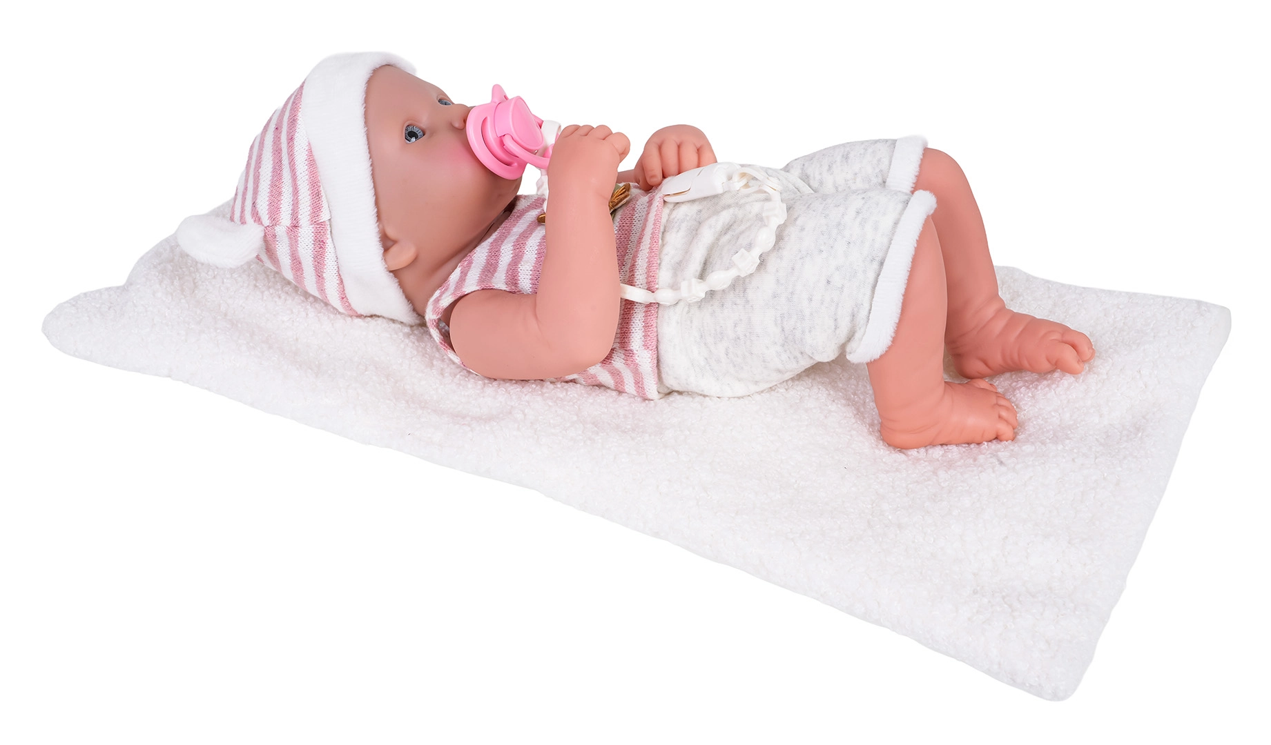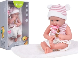 В опаковката ще намерите всичко необходимо за игра: залъгалка на връвчица за успокояване на бебето и мека завивка за повиване или приспиване. Куклата е подходяща от 3 години, има лесно сваляеми дрехи (шапчица, топ и къси панталонки) и се поддържа лесно.