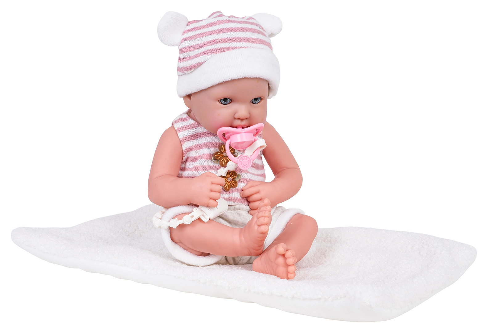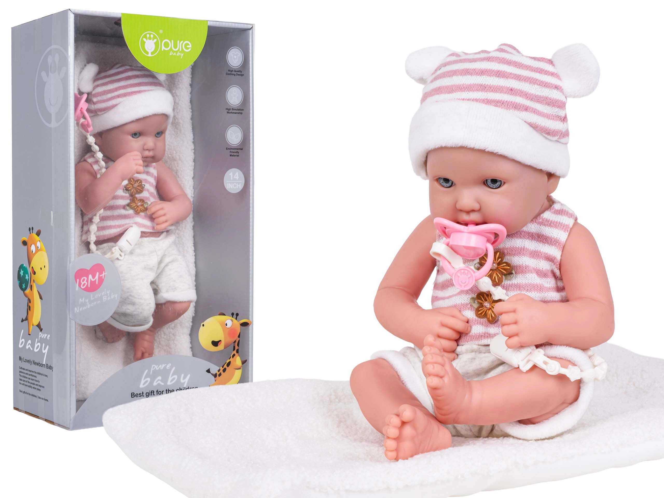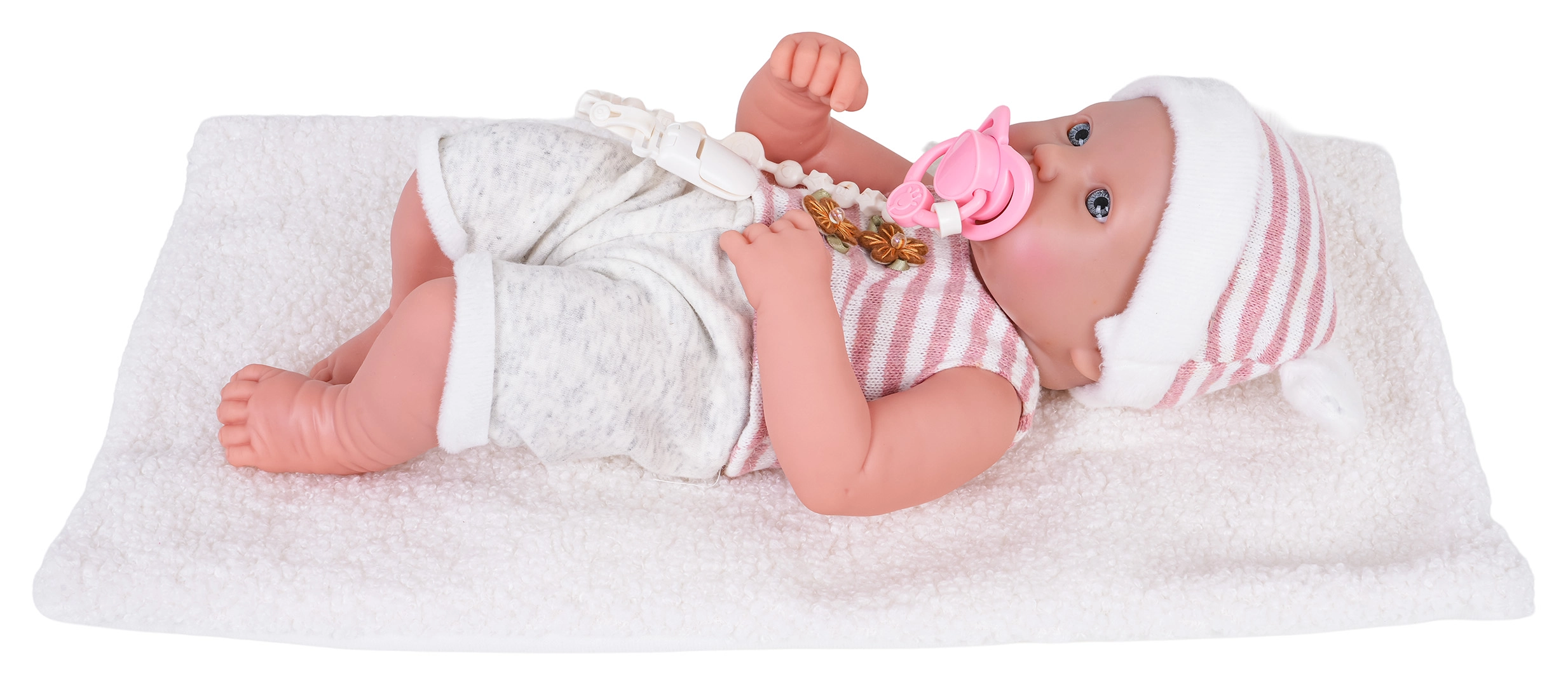 Куклата има подвижни ръце и крака, така че децата могат да я сядат, да я завиват в завивка или да държи залъгалка като истинско бебе.
