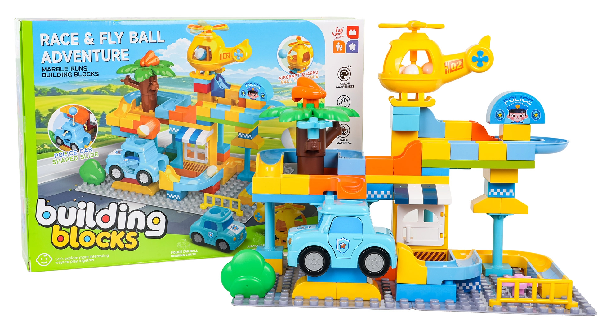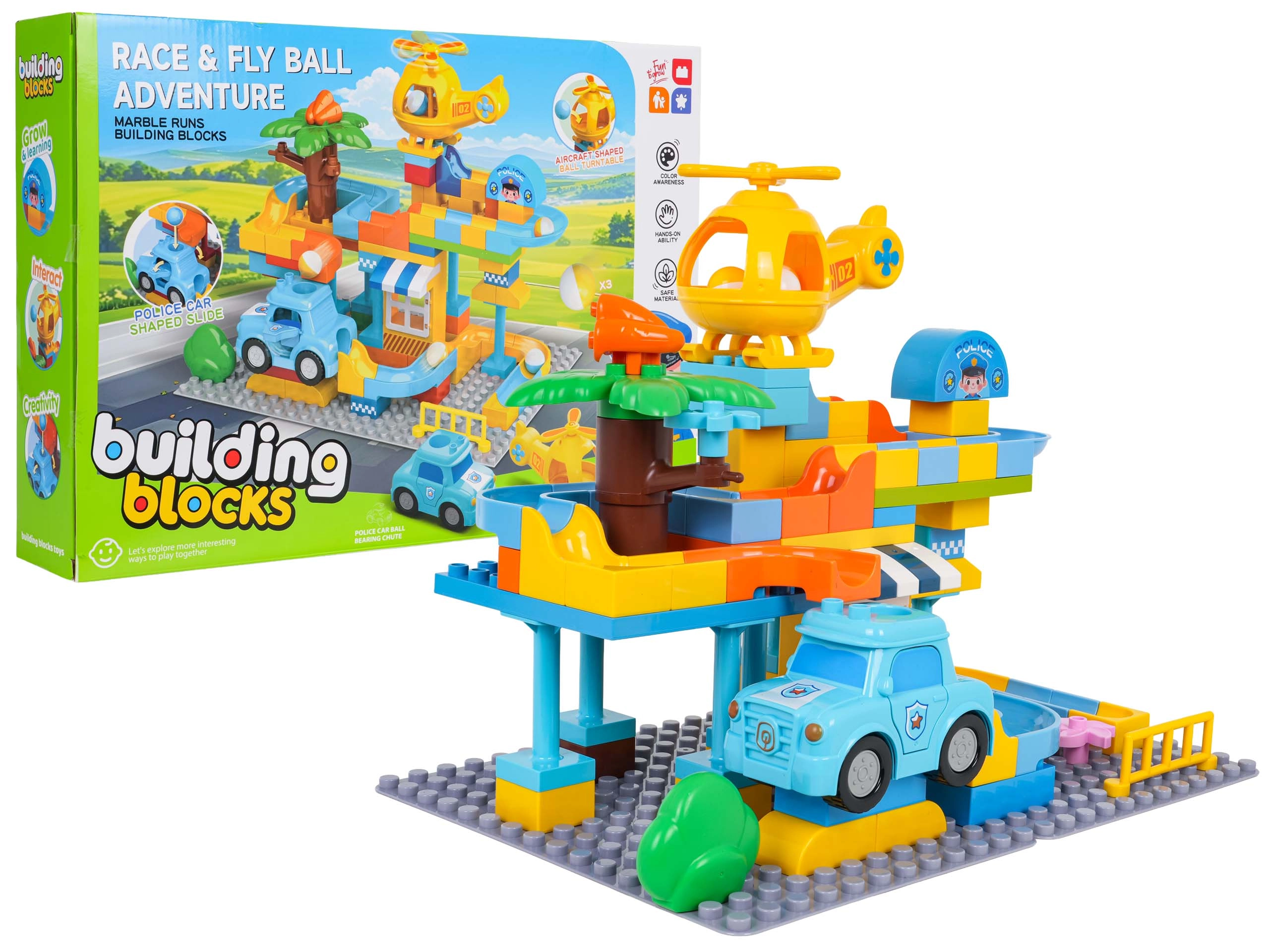 В комплекта ще намерите полицейска количка, хеликоптер и 3 топчета. Обмисленият детайл – отворите в количката и хеликоптера – позволява на топчетата да прелитат и добавя ново измерение към играта. Комплектът е изработен от качествени, безопасни материали и е подходящ за деца от 3 години.