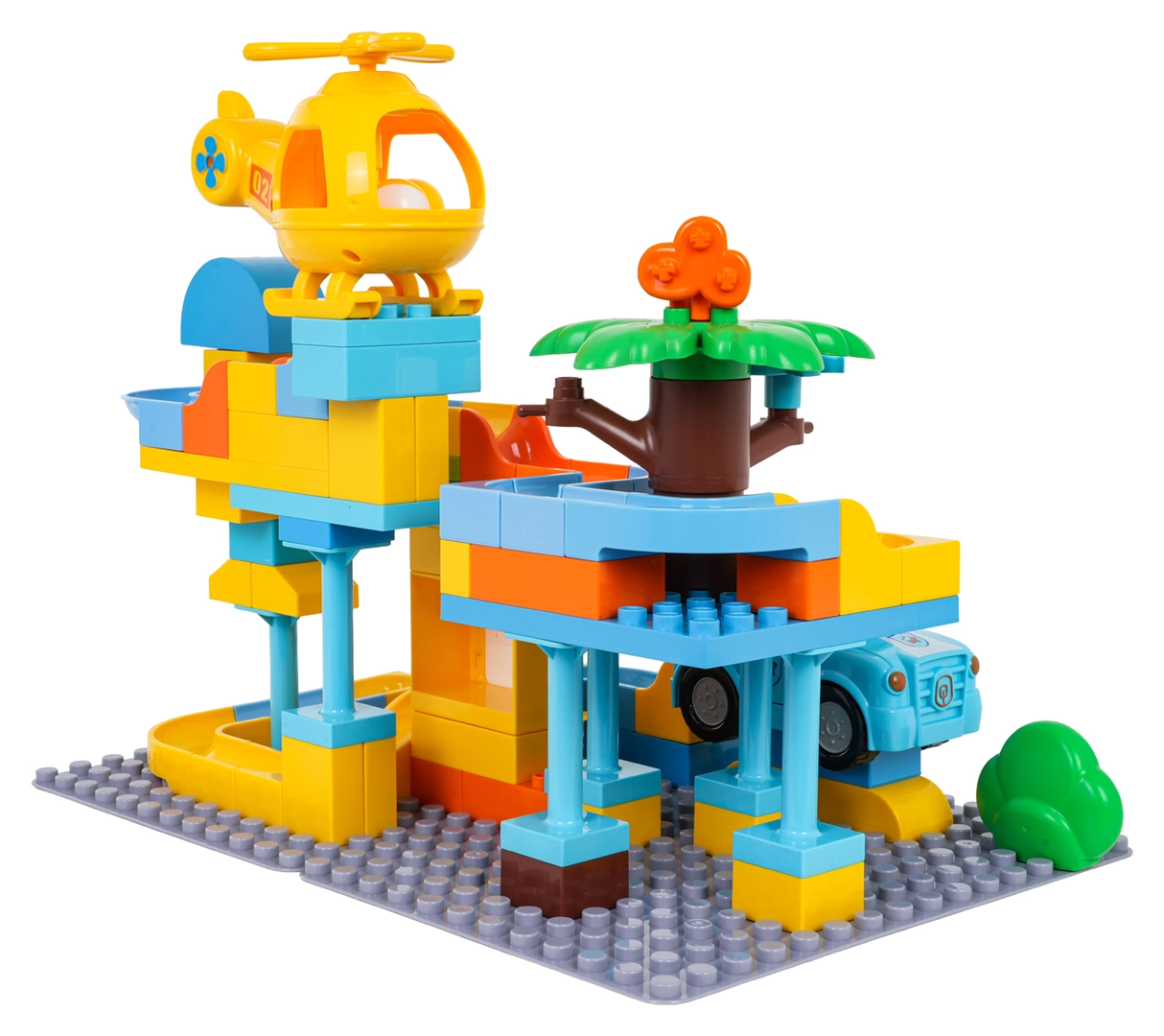 - Креативна игра: строене, спускане на количката по рампите, кацане на хеликоптера.