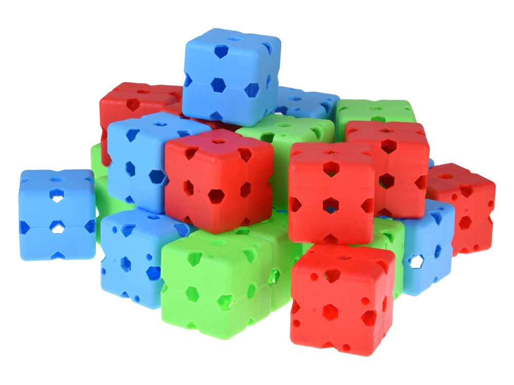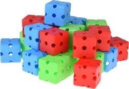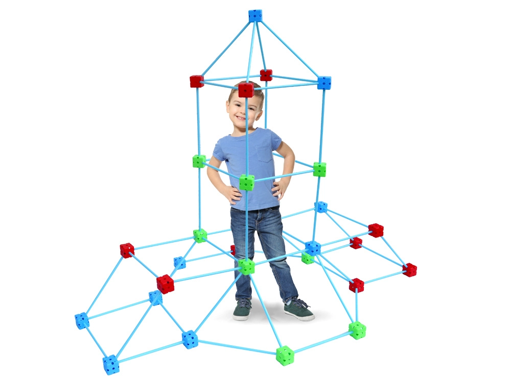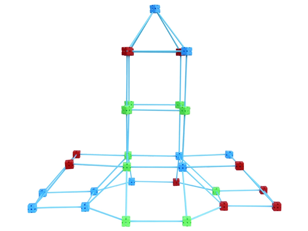 Цветни блокчета с много посочни отвори позволяват свързване на пръчиците под различни ъгли. Така лесно ще изградите кули, куполи и по-големи игрални фортове.
