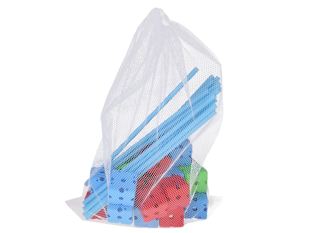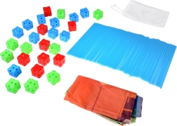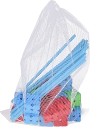 - 58× пръчица (около 38 см дължина, около 1 см диаметър), 29× свързващо блокче (около 5 × 5 × 5 см), 1× текстилно покривало с принт (около 230 × 155 см), 1× мрежеста торбичка за съхранение