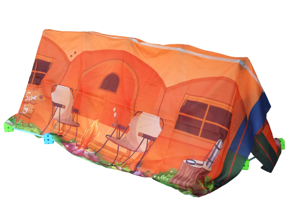 В комплектa има цветно текстилно покривало с къмпинг мотив. Просто го поставете върху конструкцията и създайте уютно място за игра.