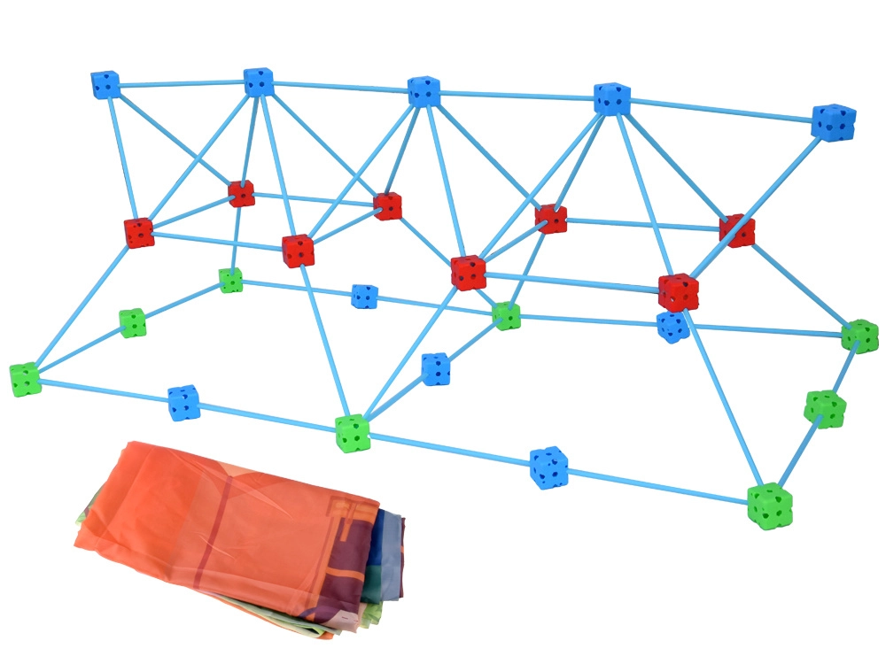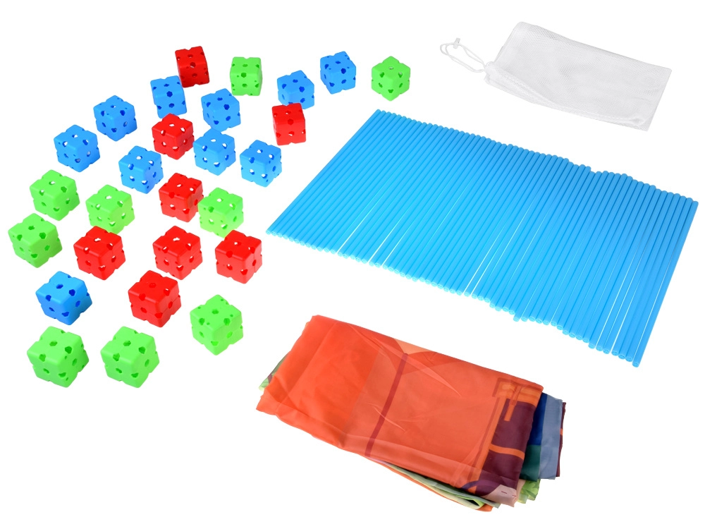 Този креативен конструктор включва 89 части за големи идеи: 58 издръжливи пръчици/сламки (около 38 см) и 29 свързващи блокчета (около 5 × 5 × 5 см), допълнени от голямо текстилно покривало с принт „къмпинг“ и практична мрежеста торбичка за съхранение. Благодарение на леките пръчици и модулните конектори децата изграждат стабилни, но лесно преносими конструкции.