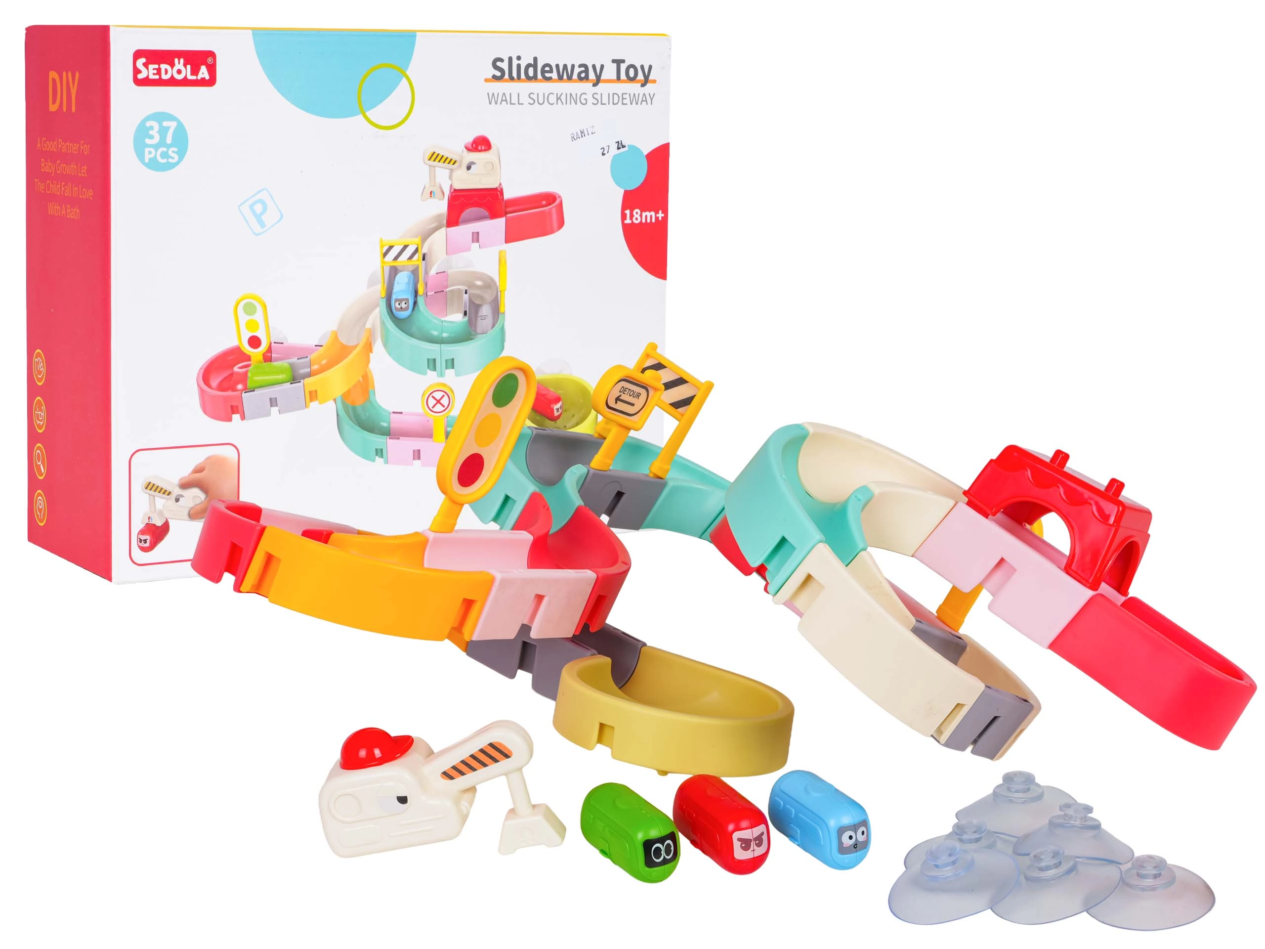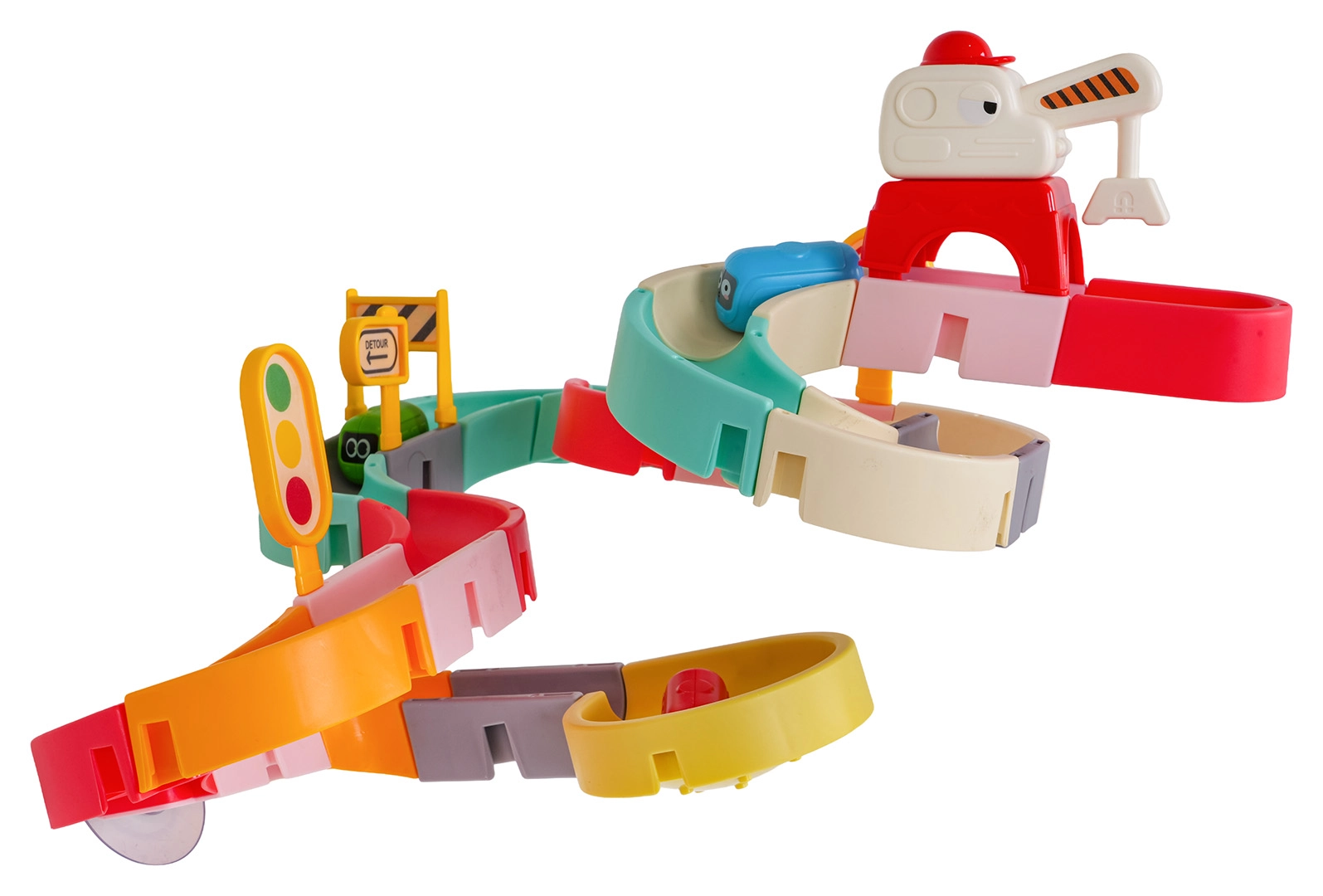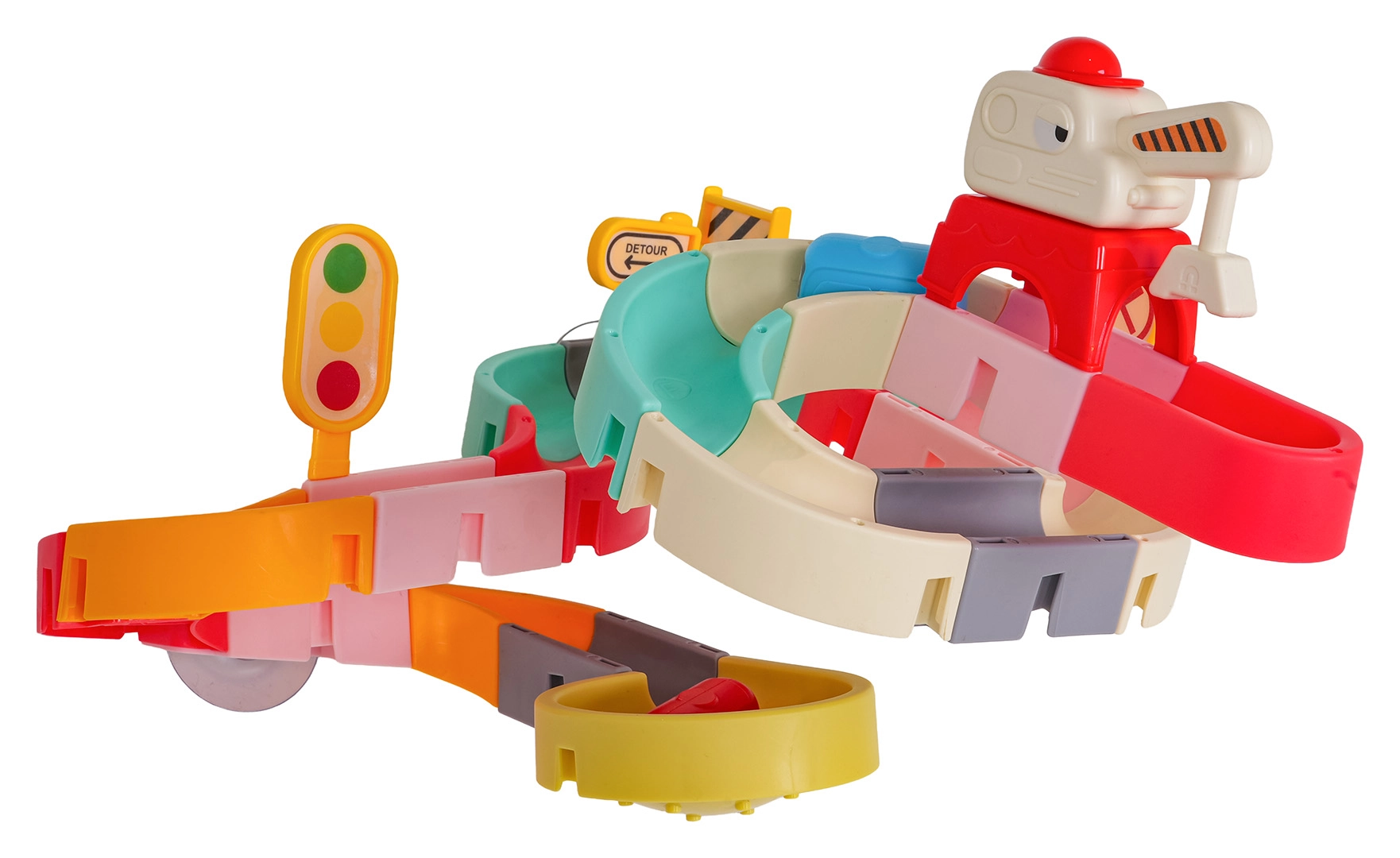 Забавлението е безопасно и разнообразно: качествен пластмасов материал без остри ръбове, силни вендузи за стабилност и ярки цветове, които мотивират децата да създават все нови трасета. Комплектът включва също пътни знаци, бариѐри и стикери за още повече креативност.