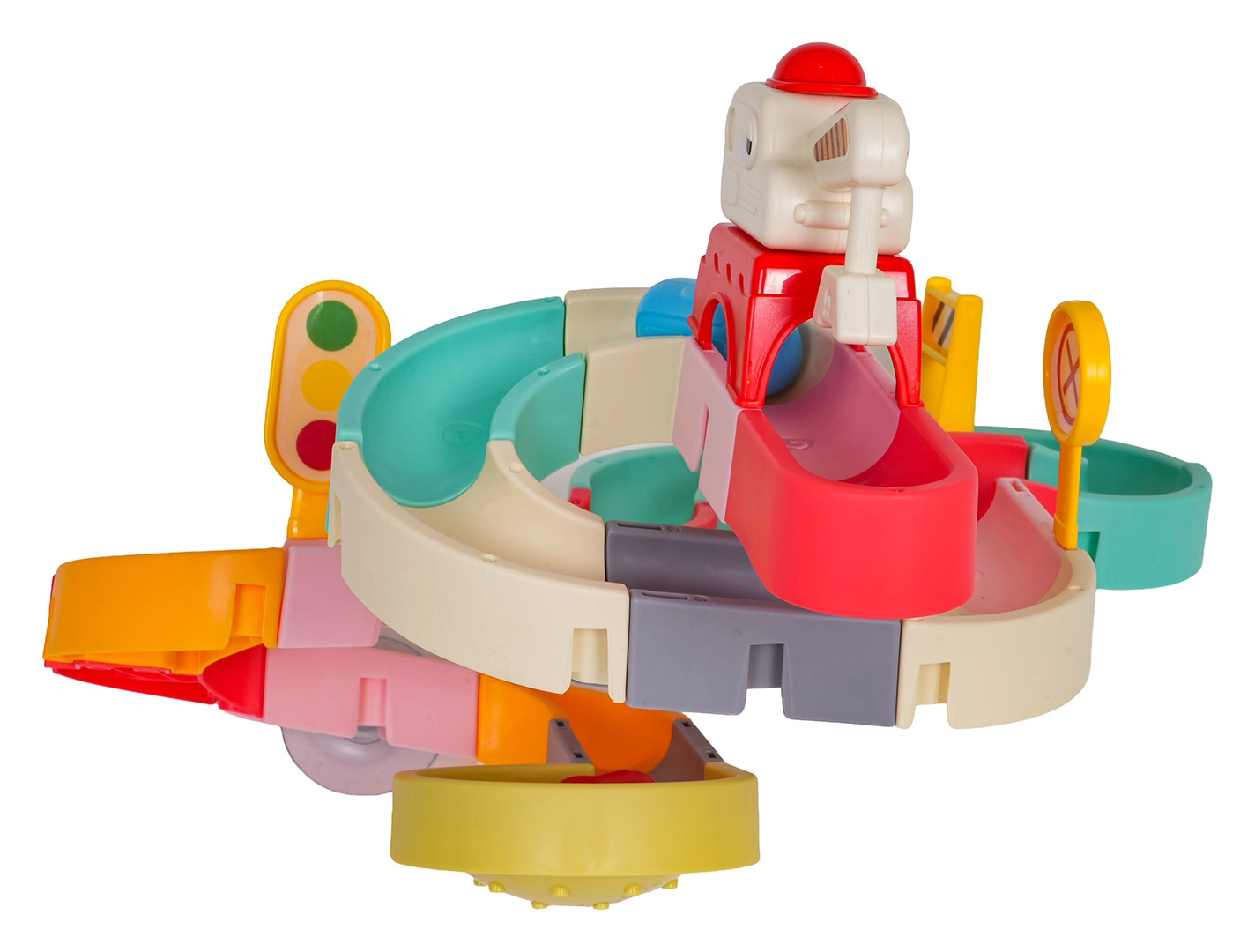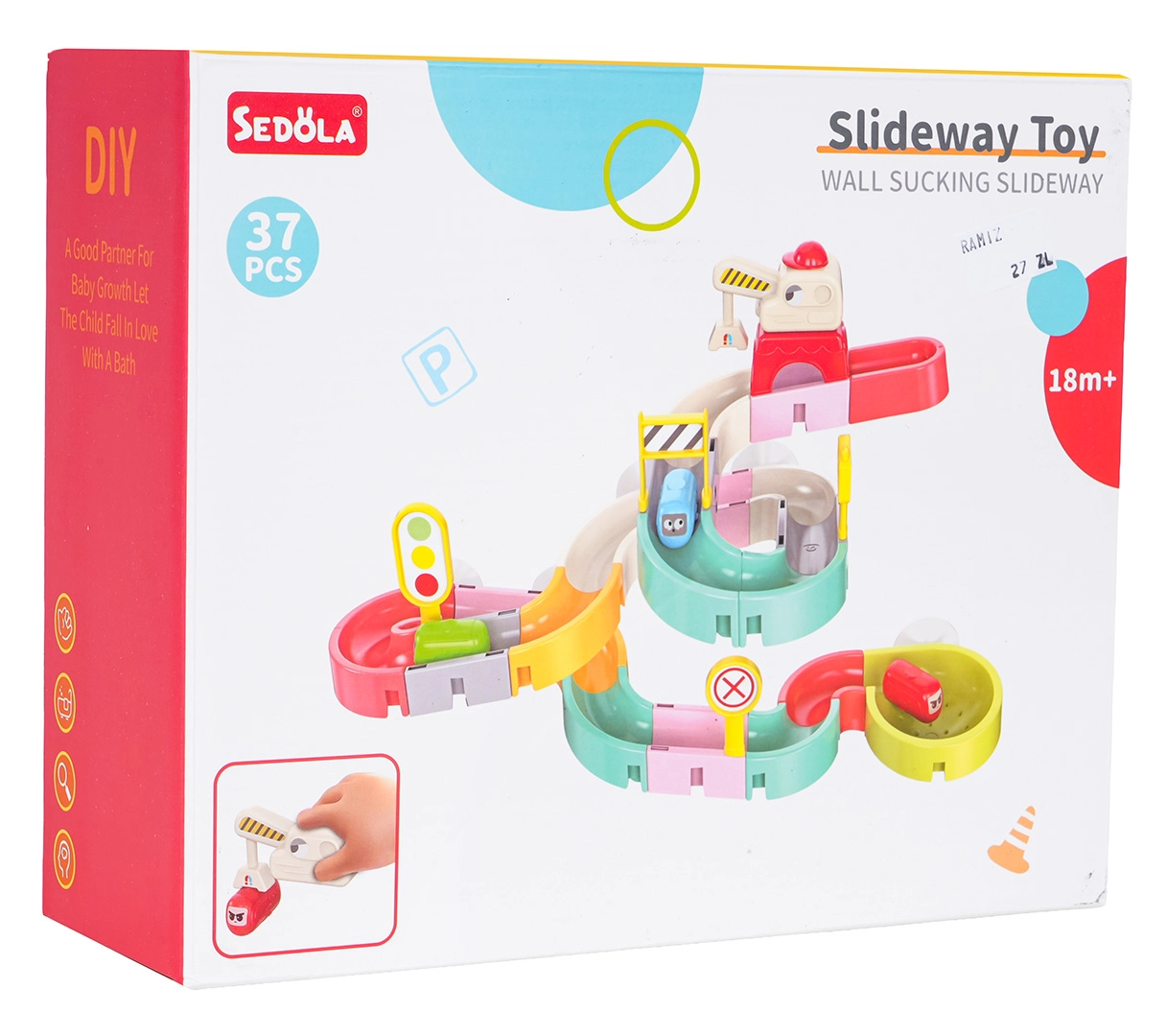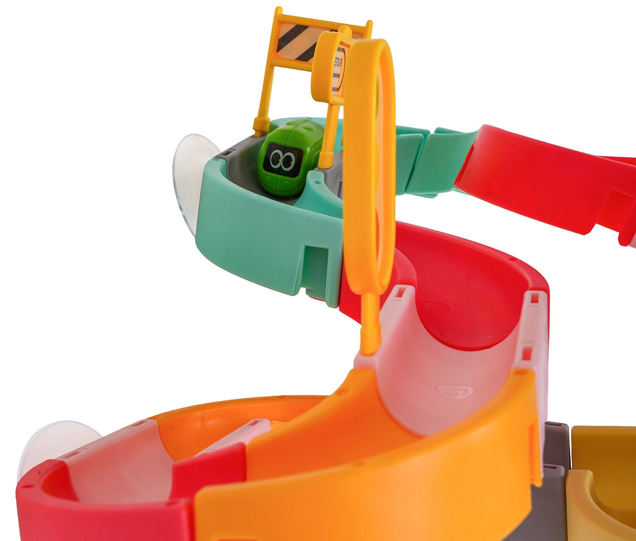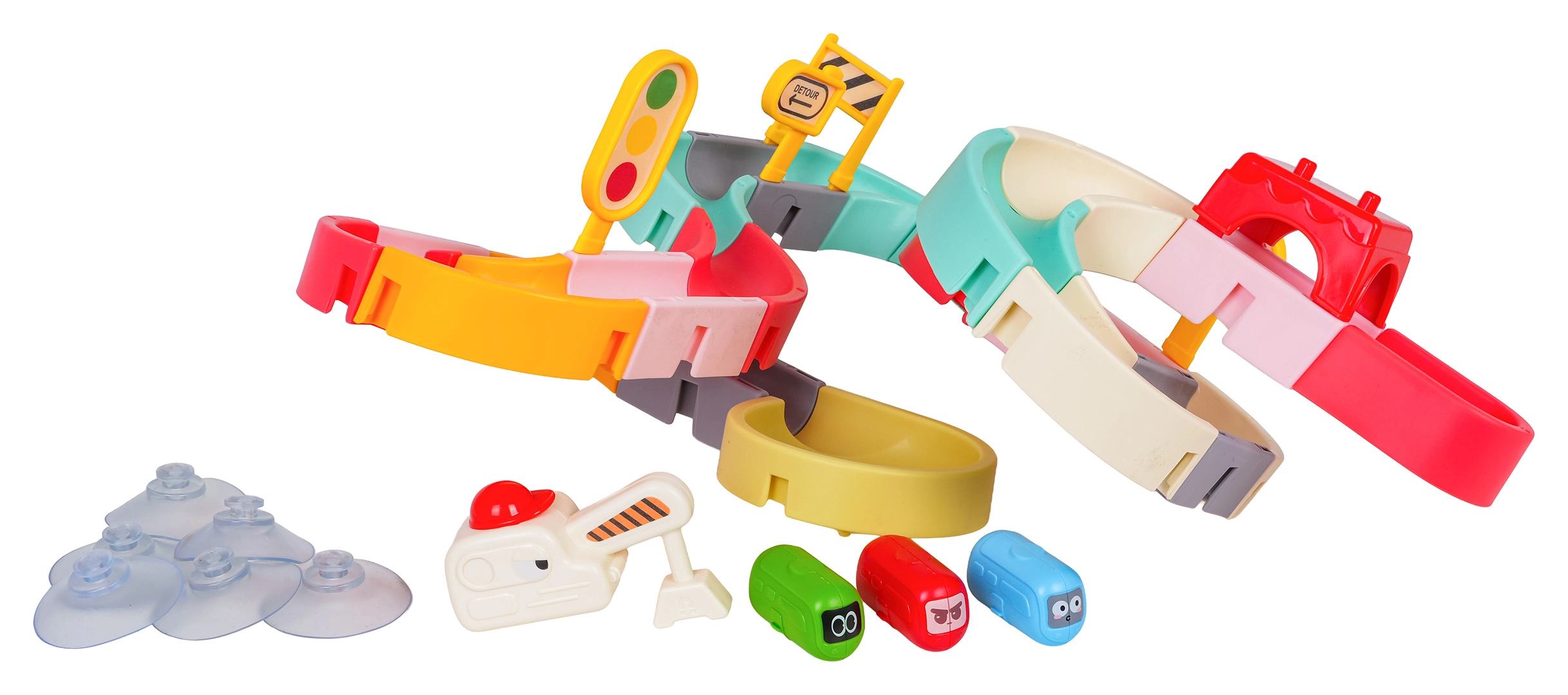 Забавлението е безопасно и разнообразно: качествен пластмасов материал без остри ръбове, силни вендузи за стабилност и ярки цветове, които мотивират децата да създават все нови трасета. Комплектът включва също пътни знаци, бариѐри и стикери за още повече креативност.