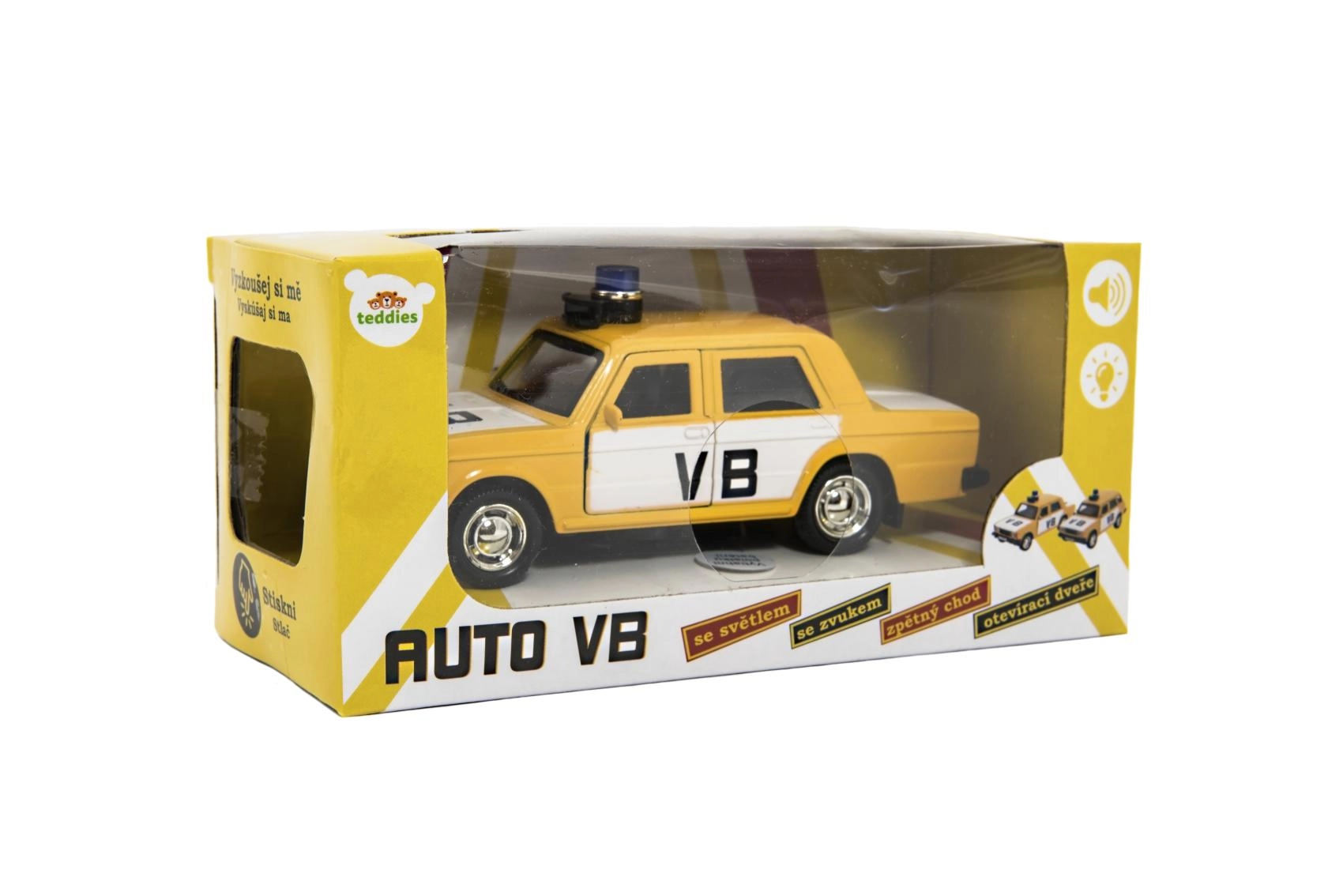 Стилен модел на полицейска кола VB Lada, който ще зарадва всеки малък полицай. Предлага обратно движение, светлинни и звукови ефекти, отварящи се предни врати и компактна дължина 12 см. Батерии 3× AG3 са включени в комплекта.