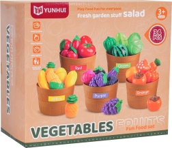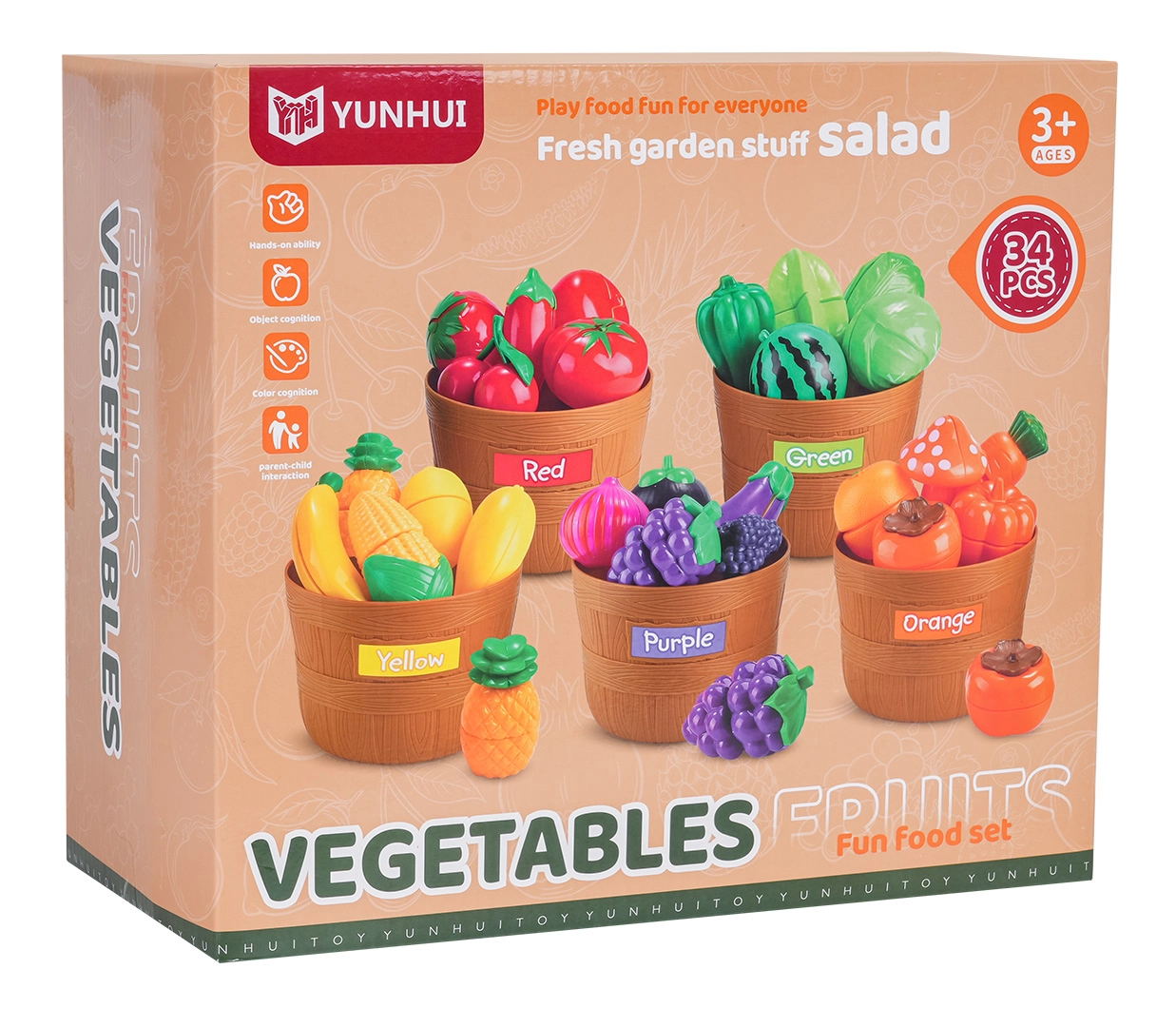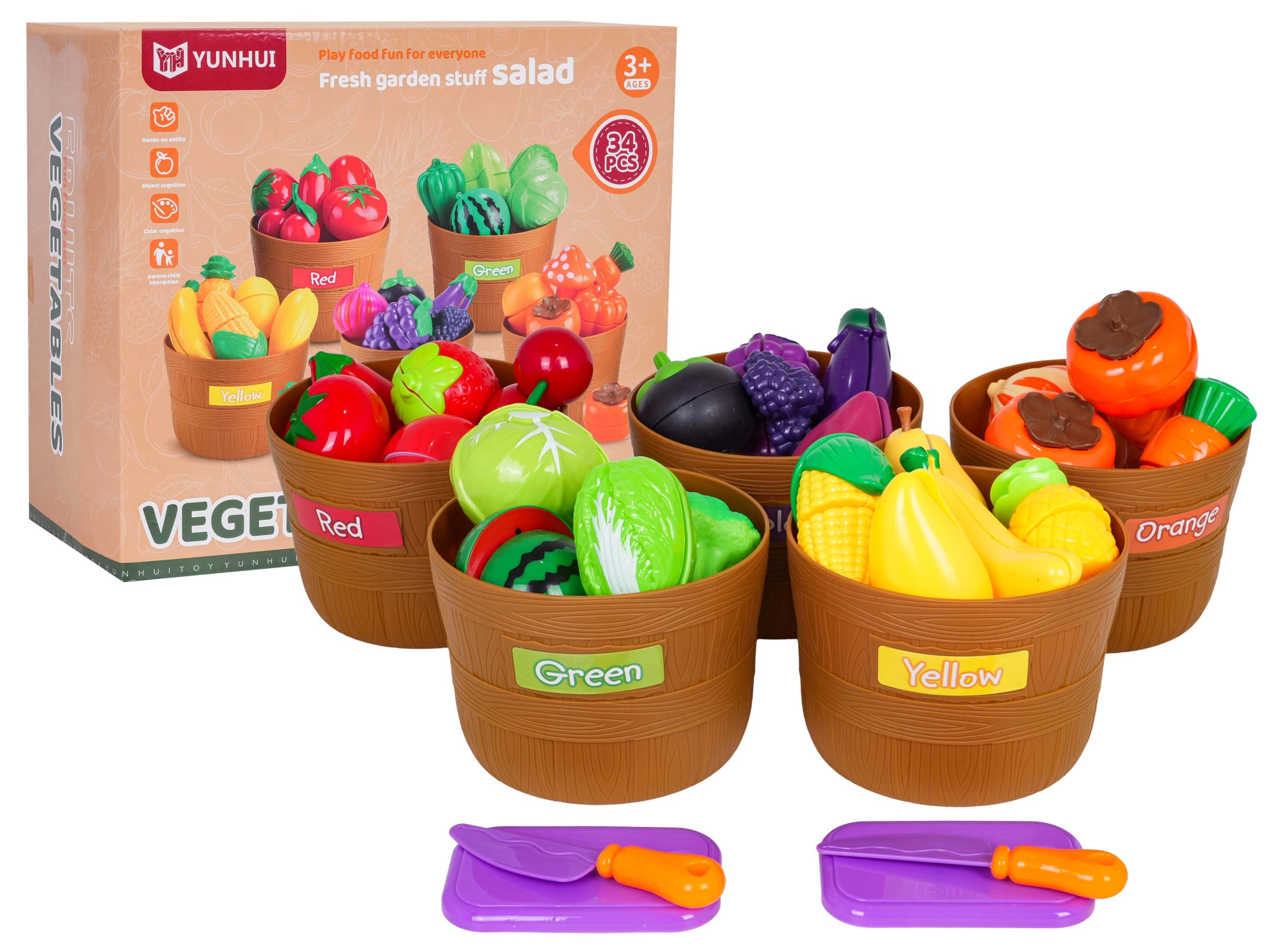 Открийте забавния дидактически комплект с плодове и зеленчуци за деца от 3 години. Сетът съдържа 34 части, включително плодове и зеленчуци със велкро за „рязане“, 5 кошнички за сортиране по цветове и 2 дъски с ножове. Качествената пластмаса в ярки цветове развива фината моторика, учи на цветовете и насърчава креативната игра на кухня.