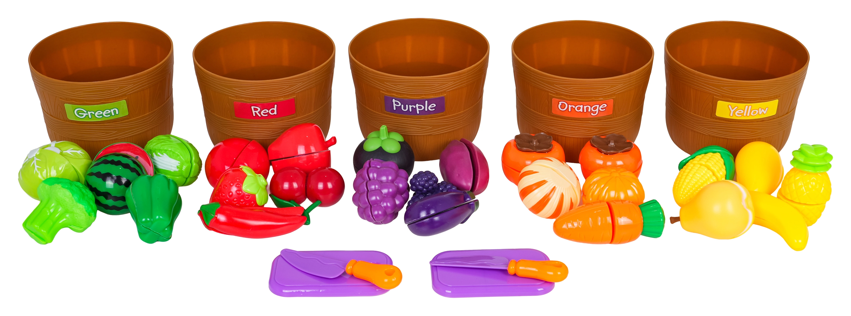 Пет обозначени кошнички (зелена, червена, лилава, оранжева, жълта) помагат на децата лесно да сортират плодовете и зеленчуците по цветове и развиват логическото мислене.