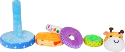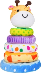 Очарователна мека пирамида във форма на жираф развива фината моторика, координацията око–ръка и ученето на сортиране по размер. Цветните, меки рингове от плюш приканват към допир и безопасна игра. В главата на жирафа е скрита свирка, която при натиск издава звук и стимулира сетивното възприятие. Идеална играчка за деца от 18 месеца.