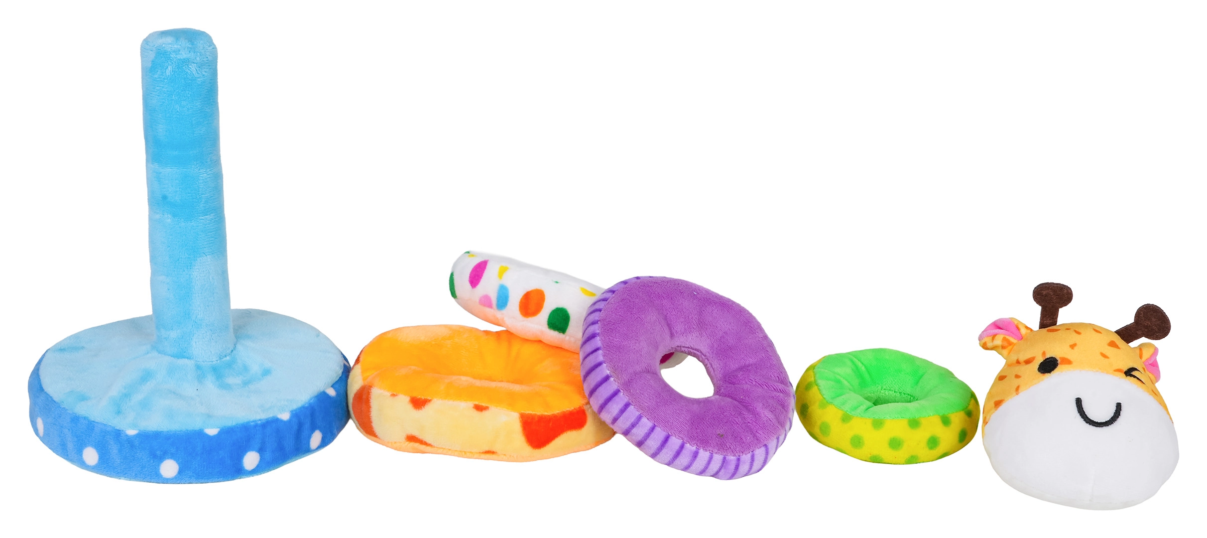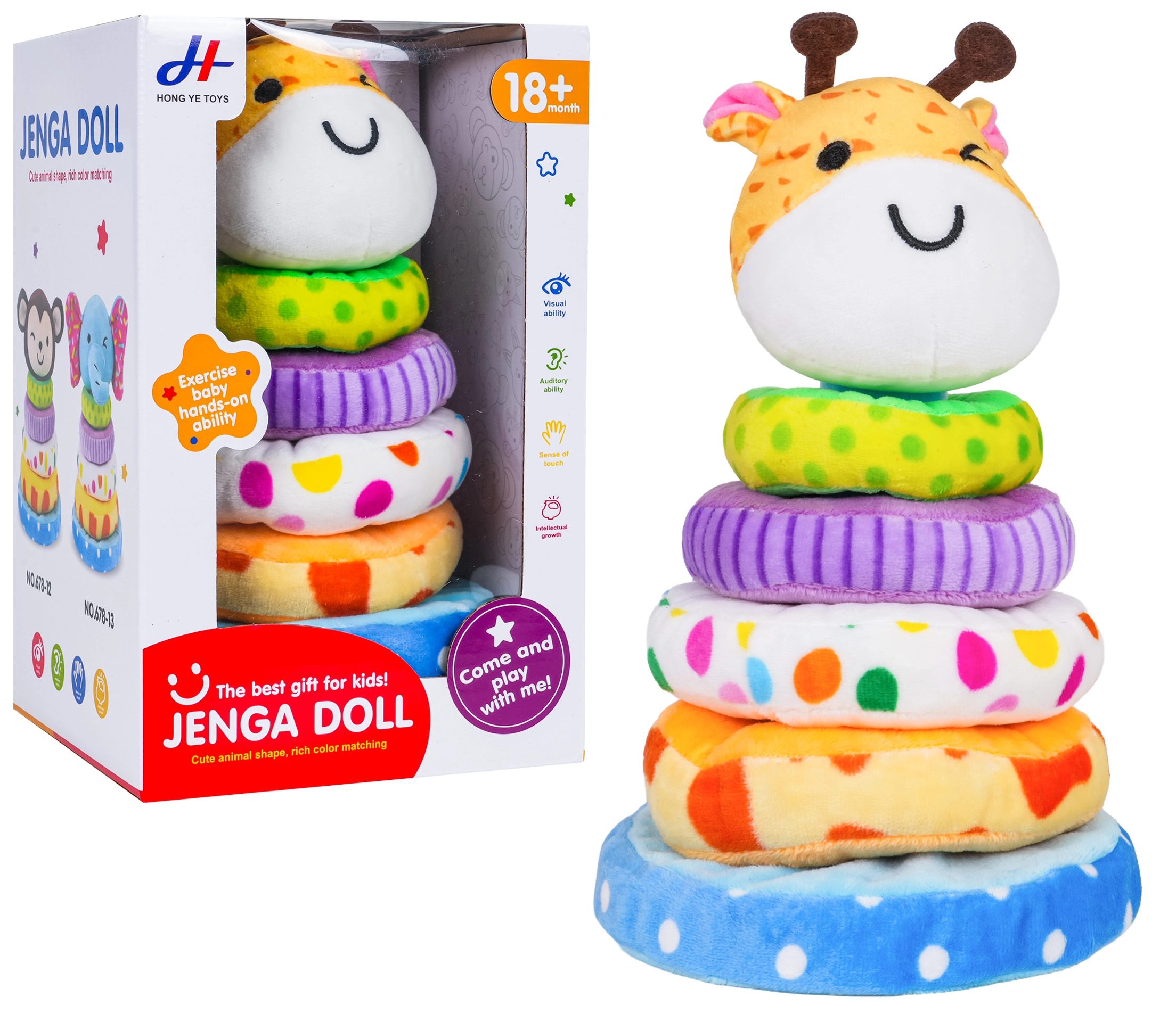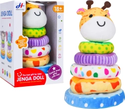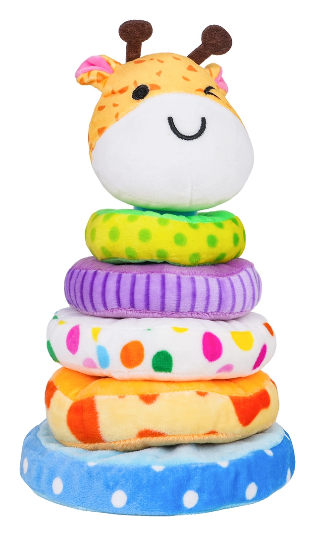 Меката подредима пирамида жираф предлага на децата забавен и безопасен начин за учене. Комплектът включва стабилна основа, четири нежни ринга с различна големина и главичка на жираф със свирка. Пъстрите шарки и приятният плюш подпомагат сетивното развитие, докато подреждането на ринговете тренира логиката и търпението.