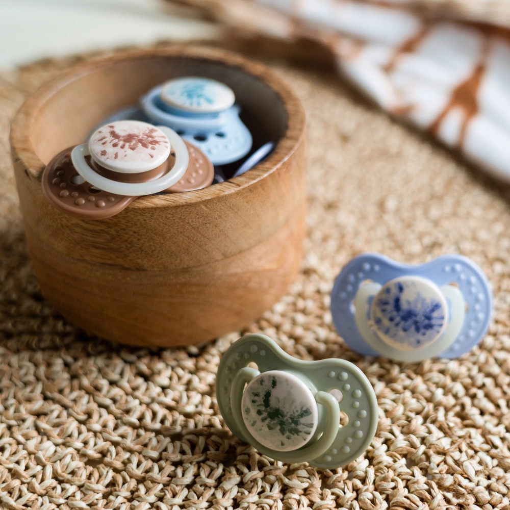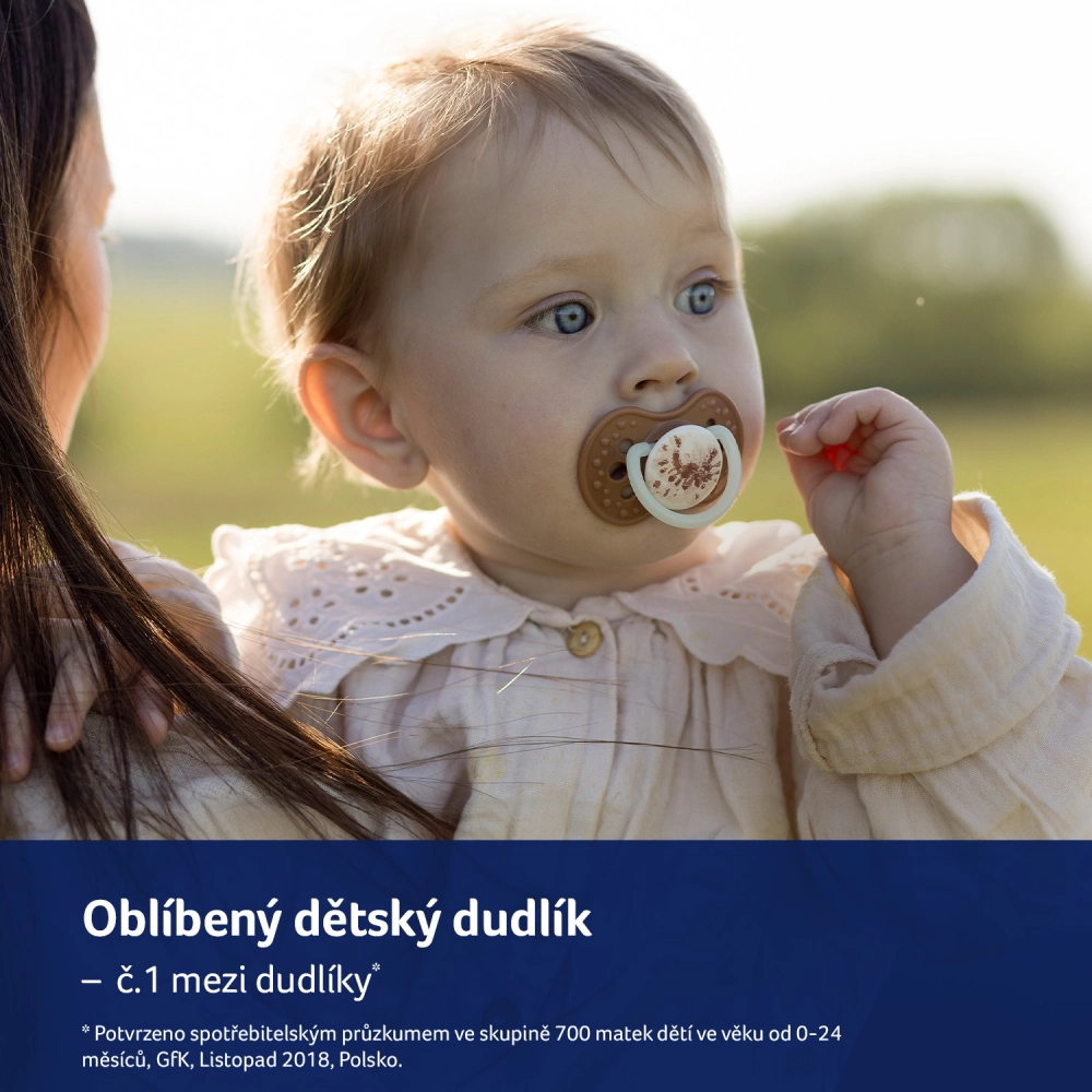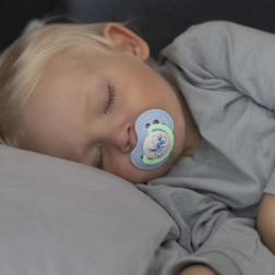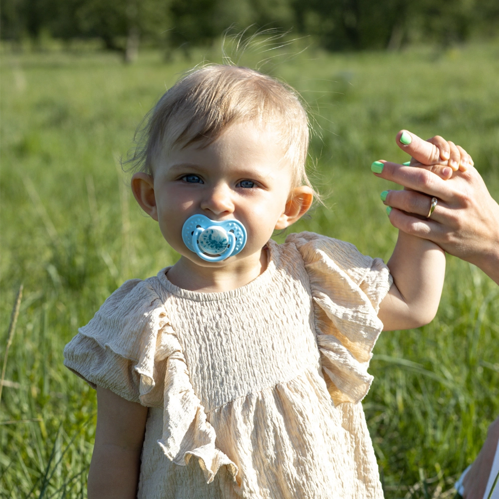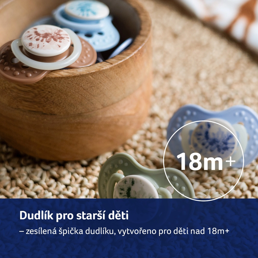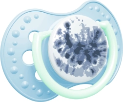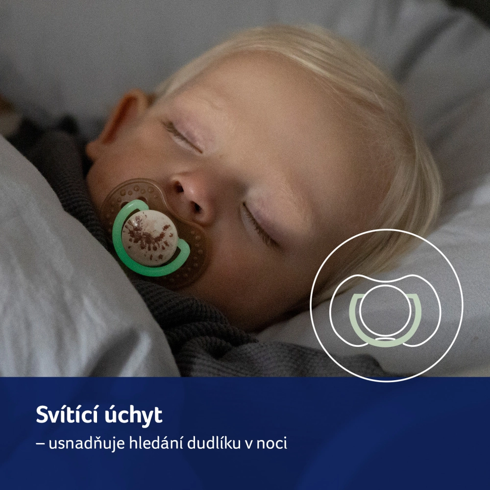 За по-големи деца (18m+) биберонът е с подсилен силиконов накрайник, по-устойчив на захапване. Светещата дръжка осигурява бързо намиране през нощта. Материалите са BPA free, без вкус и мирис, подходящи за чувствителни бебета. Включено е практично калъфче за хигиенично съхранение.