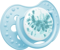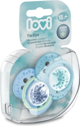 Динамичният биберон LOVI Tie Dye 18m+ имитира естественото сукане от гърда. Хомогенният силиконов слой при сукане се свива и разширява, накрайникът е симетричен и сплескан за правилна работа на езика и естествено затваряне на устата. Лекият, ергономичен щит с вентилационни отвори помага да се предотврати раздразнение на кожата, а изрязаната форма под носа улеснява свободното дишане.