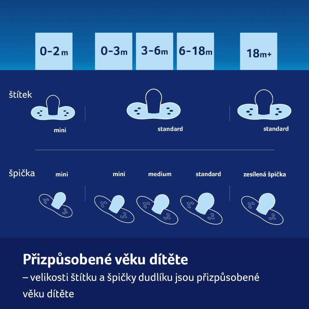 Укрепеният силиконов накрайник е по-устойчив на захапване – идеален за по-големи деца 18m+ през интензивния период на пробив на зъбите.