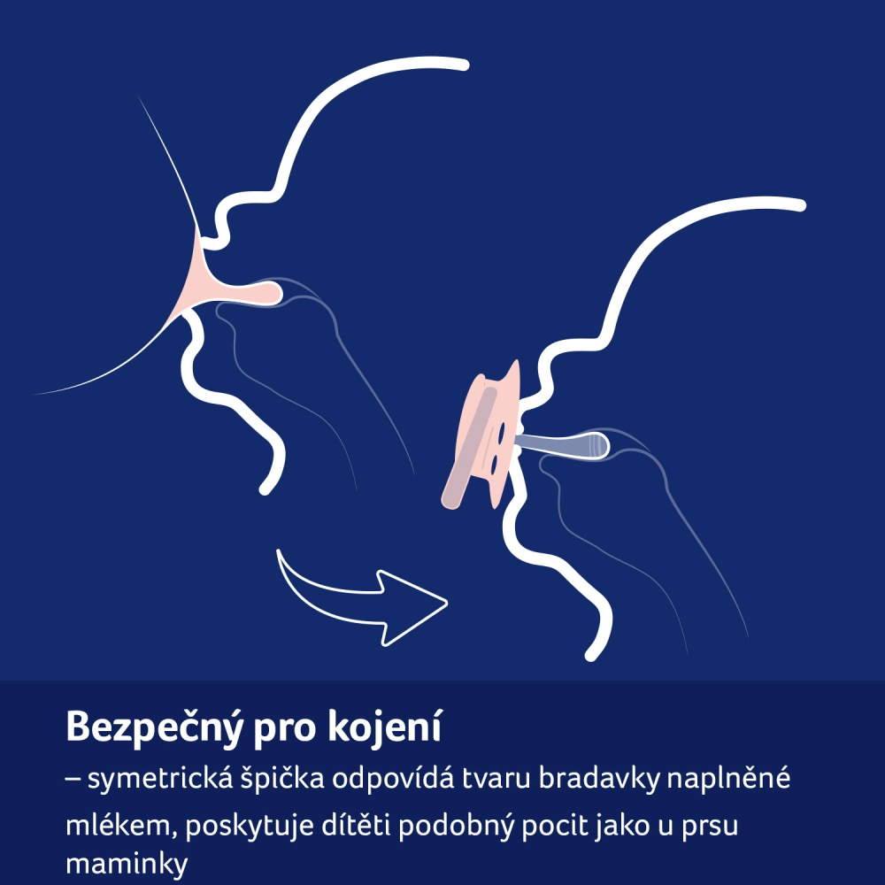 Ергономичният щит с вентилационни отвори е щадящ към кожата. Светещата дръжка улеснява бързото намиране на биберона през нощта.