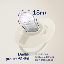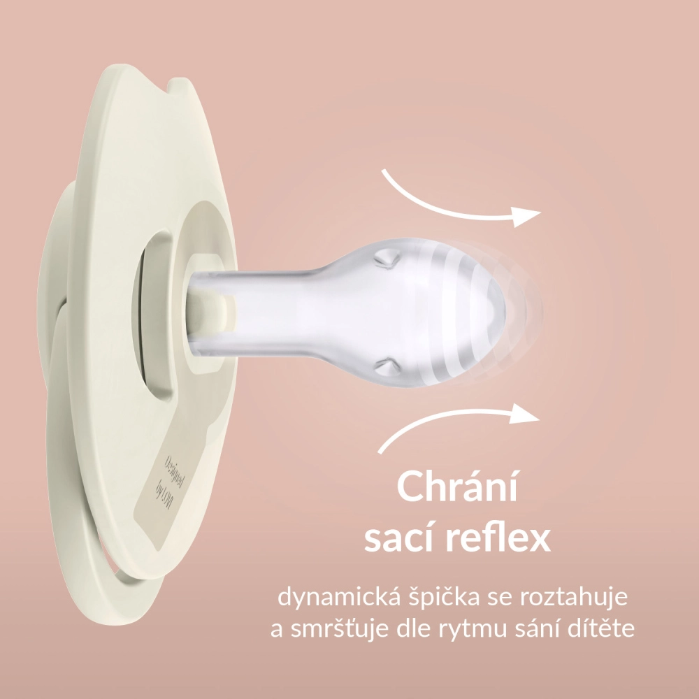 Лекият и ергономичен профилиран щит с вентилационни отвори минимизира контакта с кожата и позволява свободна циркулация на въздуха, като намалява риска от раздразнение. Издръжливият силикон запазва формата в устата, тънкото гърло и сплесканата биберона подпомагат правилната работа на венците и езика и намаляват риска от малоклузия. Стилният, хармоничен дизайн отлично се съчетава с бебешките аксесоари.