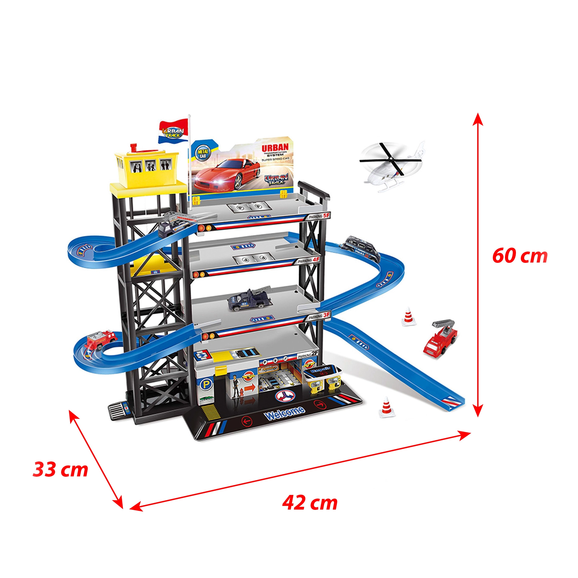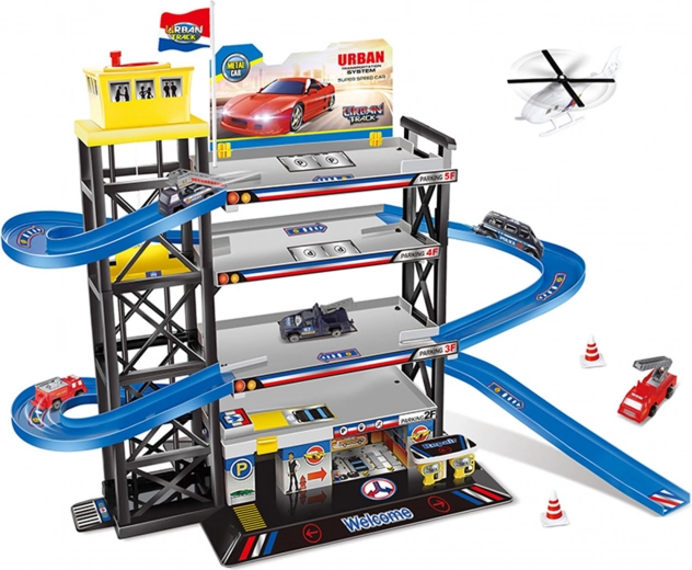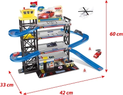 Този голям паркинг гараж с хелипорт е страхотен център за всички малки шофьори. Благодарение на четирите нива предлага достатъчно място за паркиране и креативна игра, а хелипортът добавя още едно измерение на забавлението. В комплекта ще намерите още 3 колички и 1 хеликоптер, така че можете да започнете да карате и летите веднага след сглобяването.