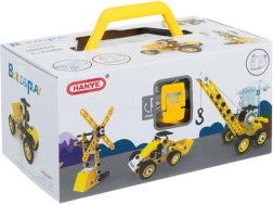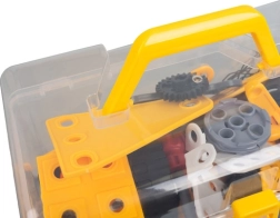 Този комплект за малки конструктори предлага богата селекция от интерактивни елементи, включително колела, зъбни колела, винтчета и инструменти, с които децата сглобяват различни движещи се превозни средства и прости механични модели. Всичко е подредено в здрава кутия за съхранение с дръжка, така че комплектът лесно се пренася и прибира.