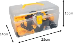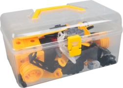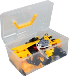 Открийте креативен конструктор с 100 части, който позволява на децата да сглобяват превозни средства и работещи механизми с помощта на винтове, колела и зъбни колела. Практичната преносима кутия с дръжка държи всичко подредено и улеснява прибирането и пътуването. Страхотен образователен подарък за развитие на фината моторика, логиката и техническото мислене.