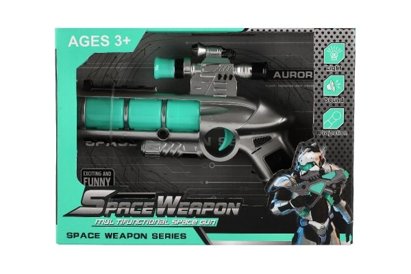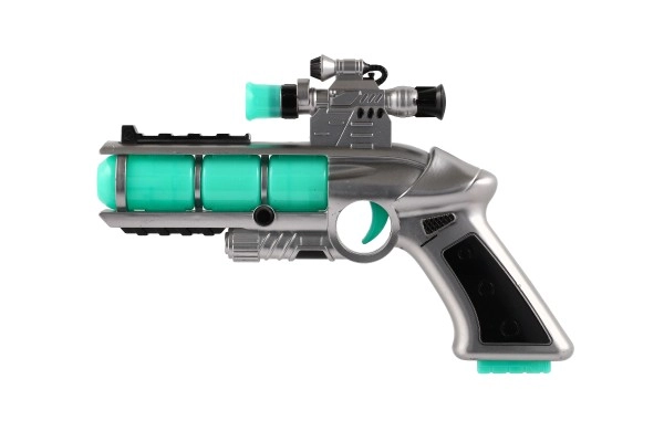 За всички малки любители на играчките-оръжия представяме футуристичния детски пистолет, който е не само естетически привлекателен, но и пълен с функции. След поставяне на 2x AA батерии пистолетът светва и издава автентични звуци. Този интерактивен преживелищен момент гарантира часове забавление: