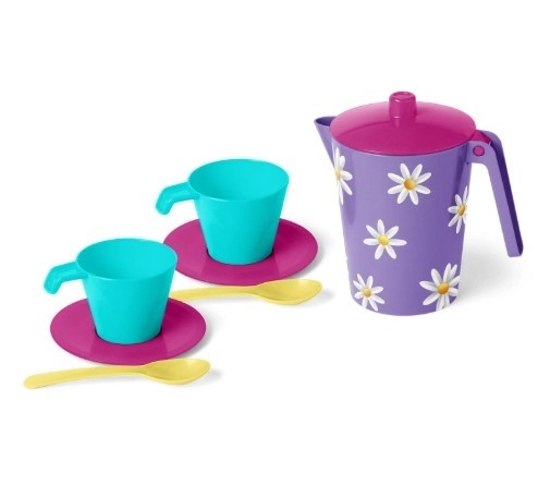 Очарователният детски комплект за кафе ще зарадва всеки малък готвач. Съдържа 7 части – каничка с IML графика, 2 чашки, 2 чинийки и 2 лъжички. Изработен е от безопасни материали, подходящи за контакт с храни, може да се мие в съдомиялна и да се използва в микровълнова фурна. Перфектен за игра с връстници, развива фантазията, фината моторика и социалните умения.
