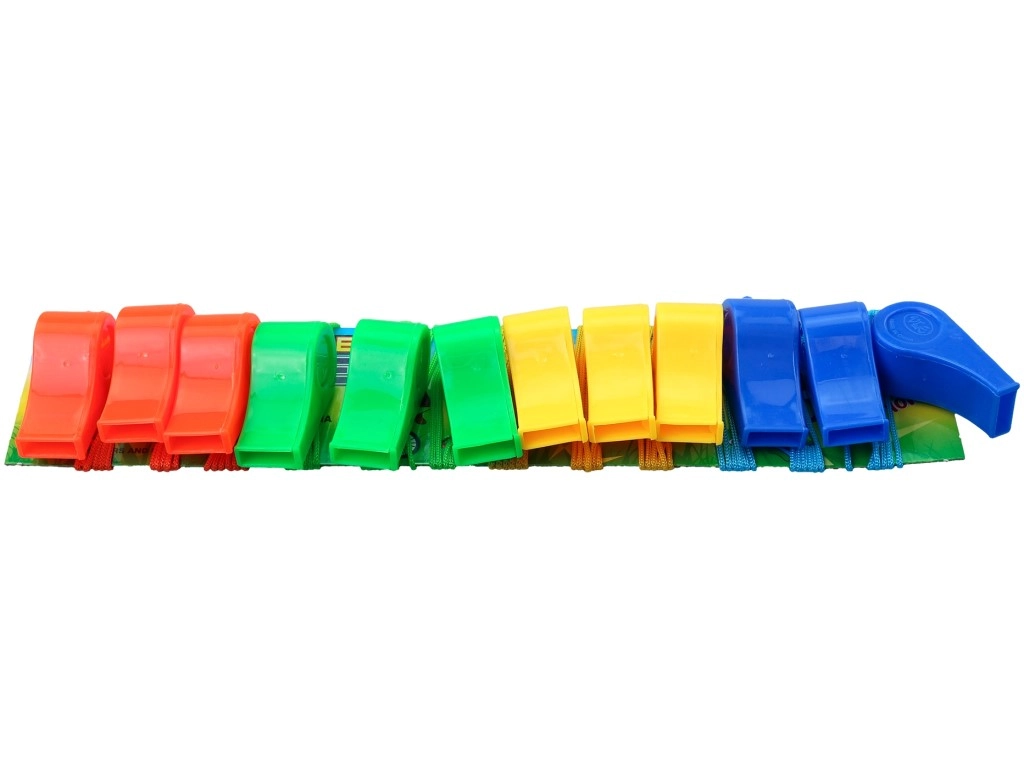 Добавете забавление и звук към всяко събитие! Този комплект предлага 12 издръжливи свирки от качествена пластмаса, подходящи за детски партита, училищни прояви, лагери и спортно подкрепяне. Ярките цветове улесняват разделянето на отбори и носят радост при всяка игра.