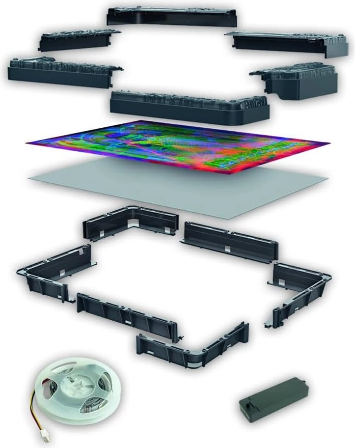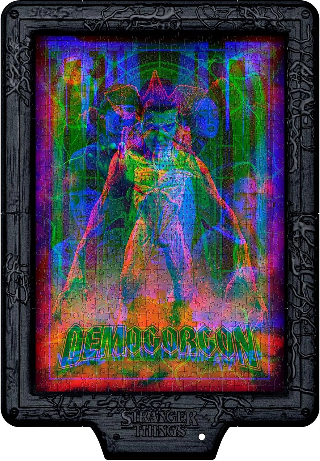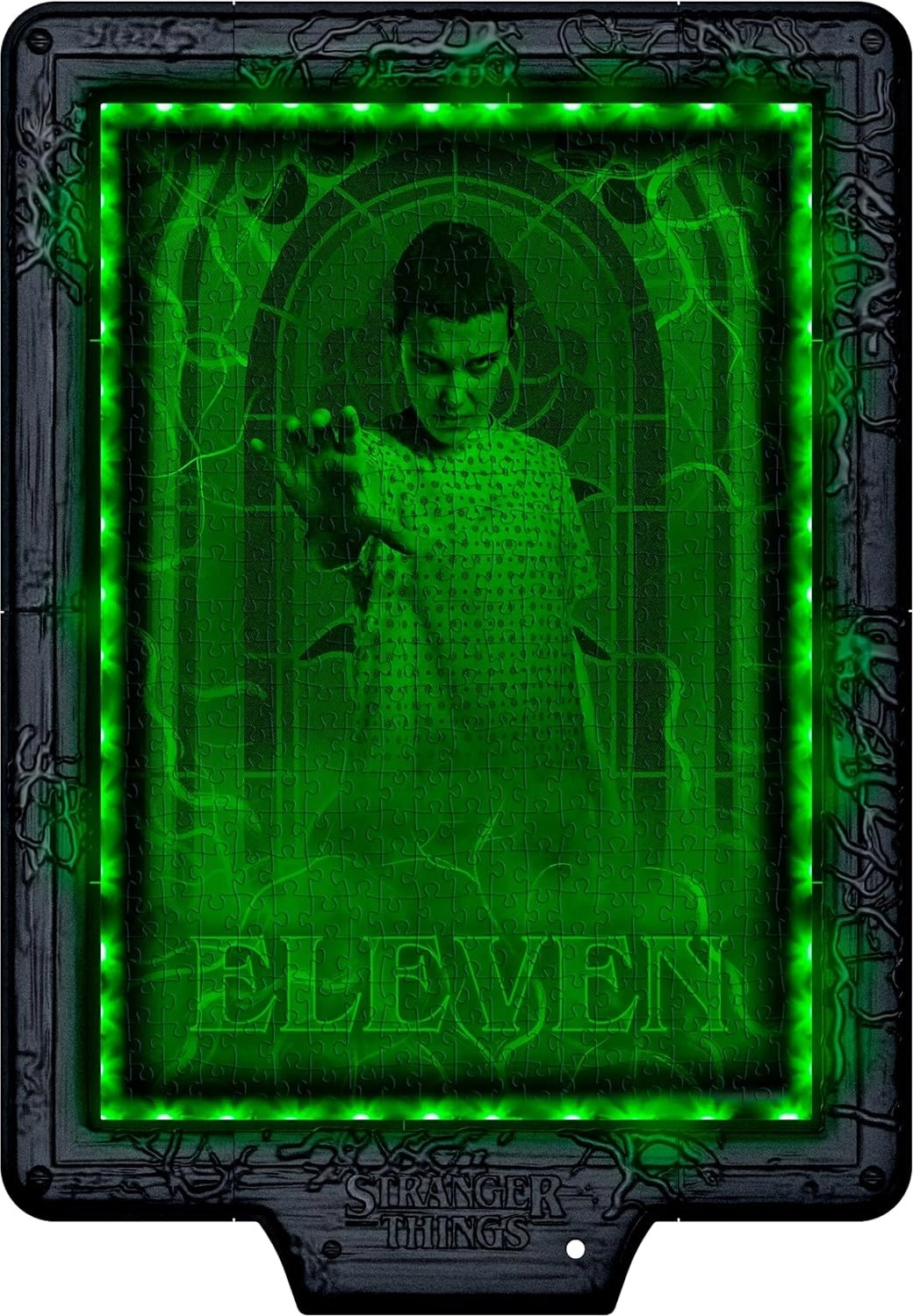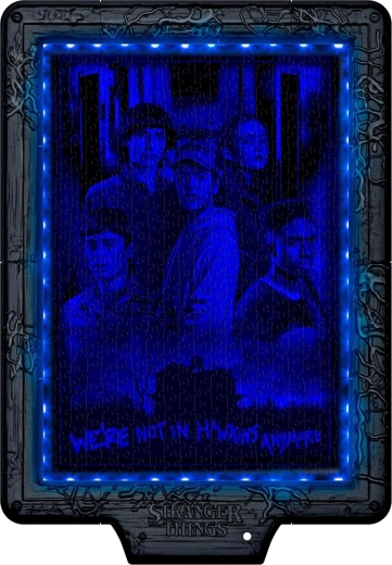 Този уникален пъзел пренася филмовата атмосфера на сериала STRANGER THINGS във вашия дом. Благодарение на вградения електронен модул и RGB LED лента изображението се променя при включване – всеки LED цвят разкрива различен слой от сцената с Лова на Демогоргона. При обикновено осветление ще видите композиция с припокриване на три цветови нива, а в тъмното всеки оттенък разкрива нов детайл.