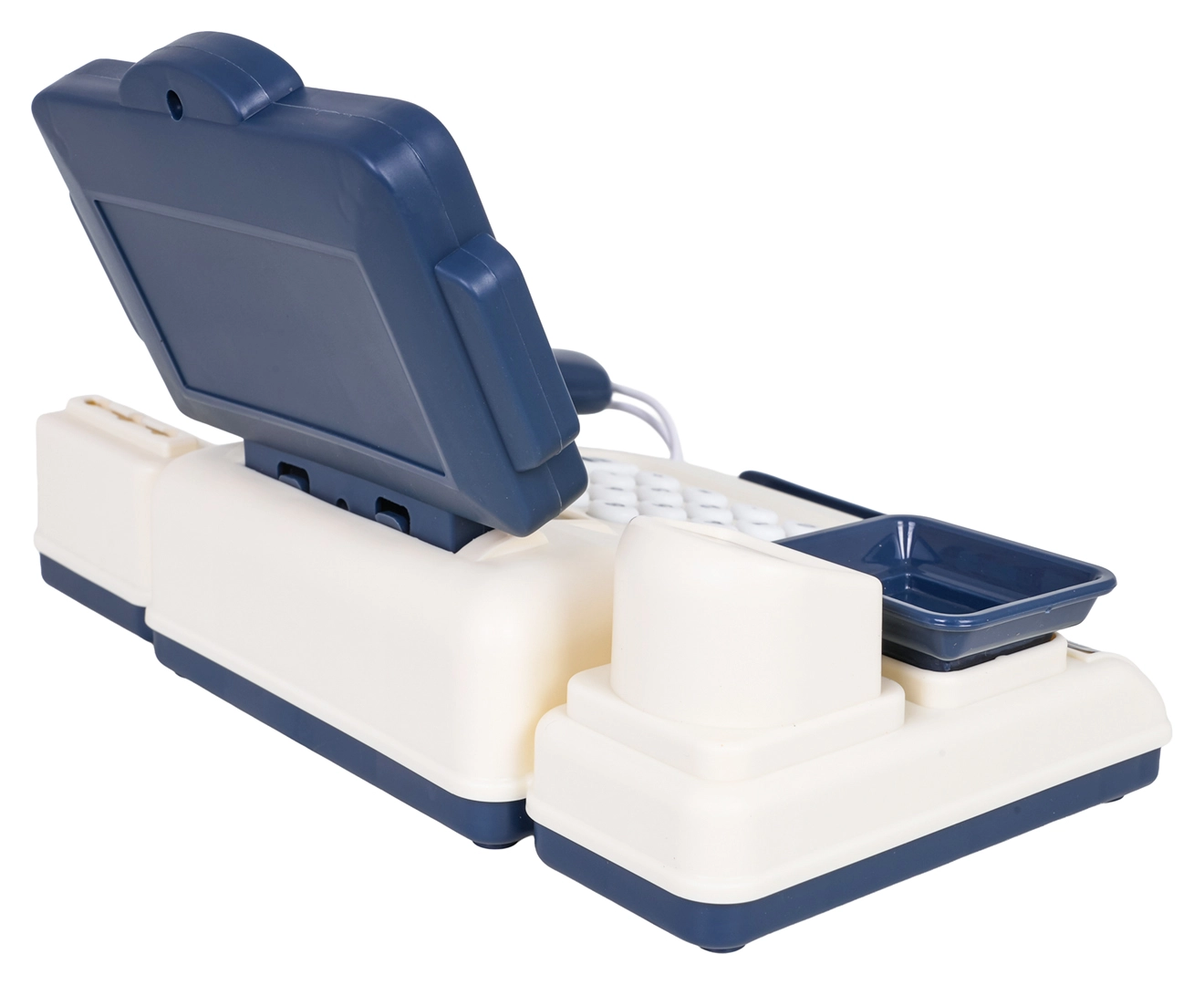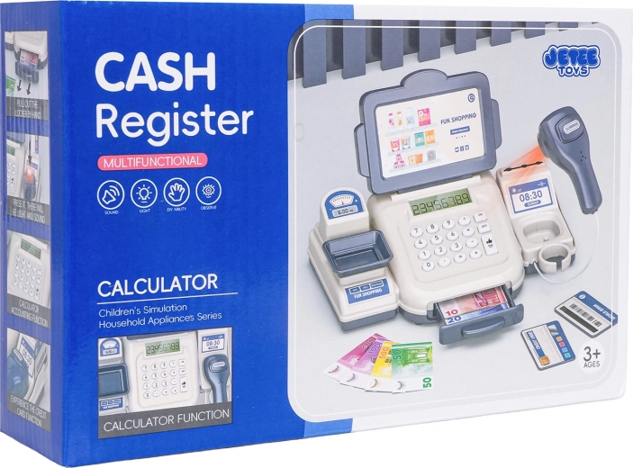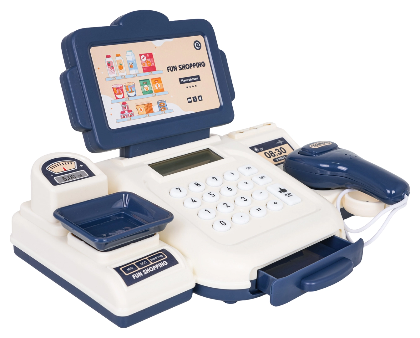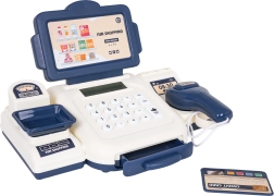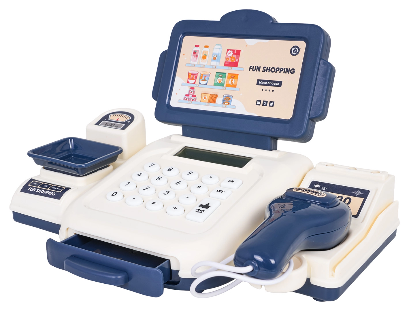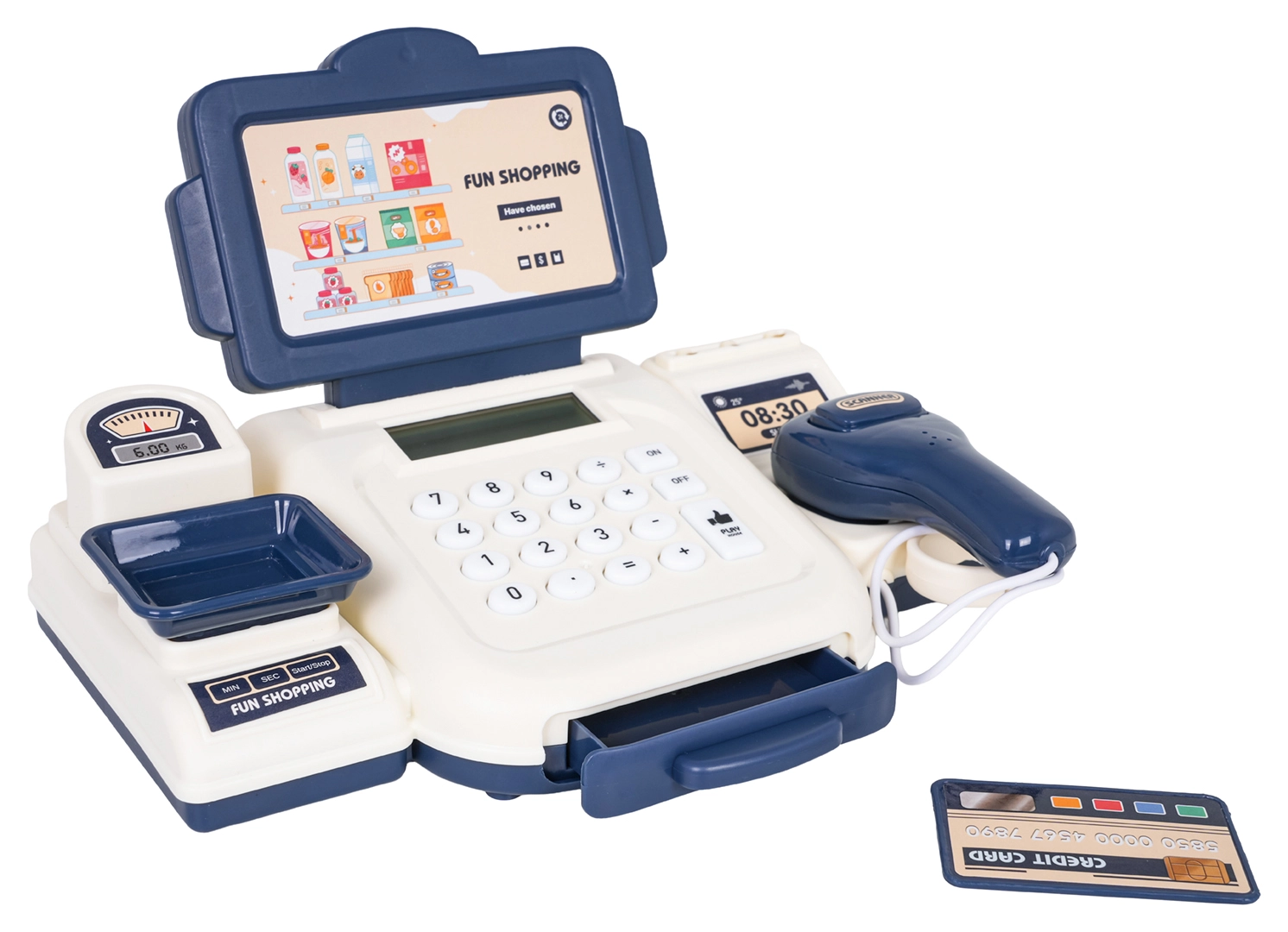 Играта на магазин никога не е била по-забавна! Тази детска каса в синьо-кремав дизайн предлага функционален калкулатор, скенер със светлина и звук, везна и отварящо се чекмедже за пари. В комплекта ще намерите също платежна карта и хартиени банкноти, така че малките продавачи могат да тренират броене и безкасово плащане.