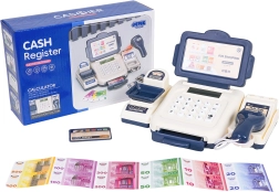 Комплектът включва играчки банкноти с различни стойности и платежна карта, така че децата могат да изпробват плащане в брой и с карта. Отварящото се чекмедже за пари и ясният дисплей създават автентична атмосфера на магазин – перфектно за самостоятелна игра и забавление с приятели и братя и сестри.