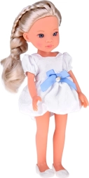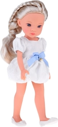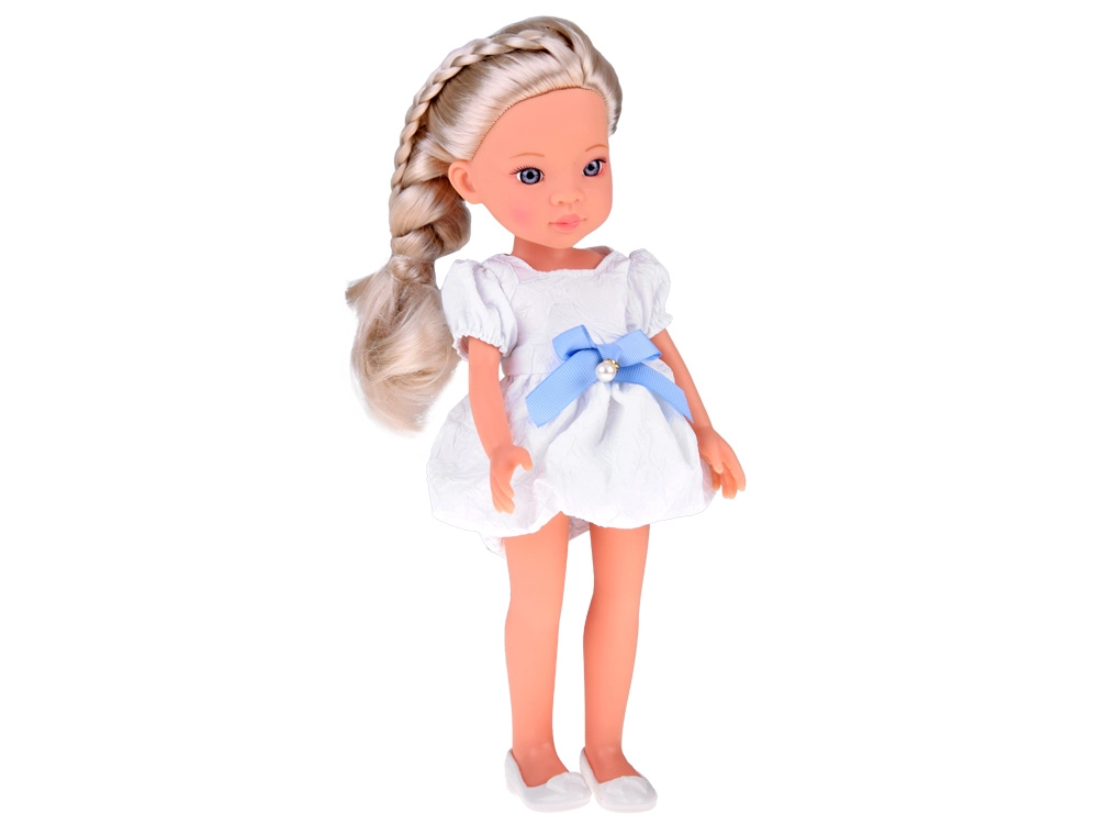 Комплектът включва очарователна бяла рокля със синя панделка и фин перлен орнамент и бели балеринки. Детайлно оформеното лице с изразителни, блестящи очи придава реалистично изражение и превръща куклата в прекрасна спътничка за детската стая и колекцията.