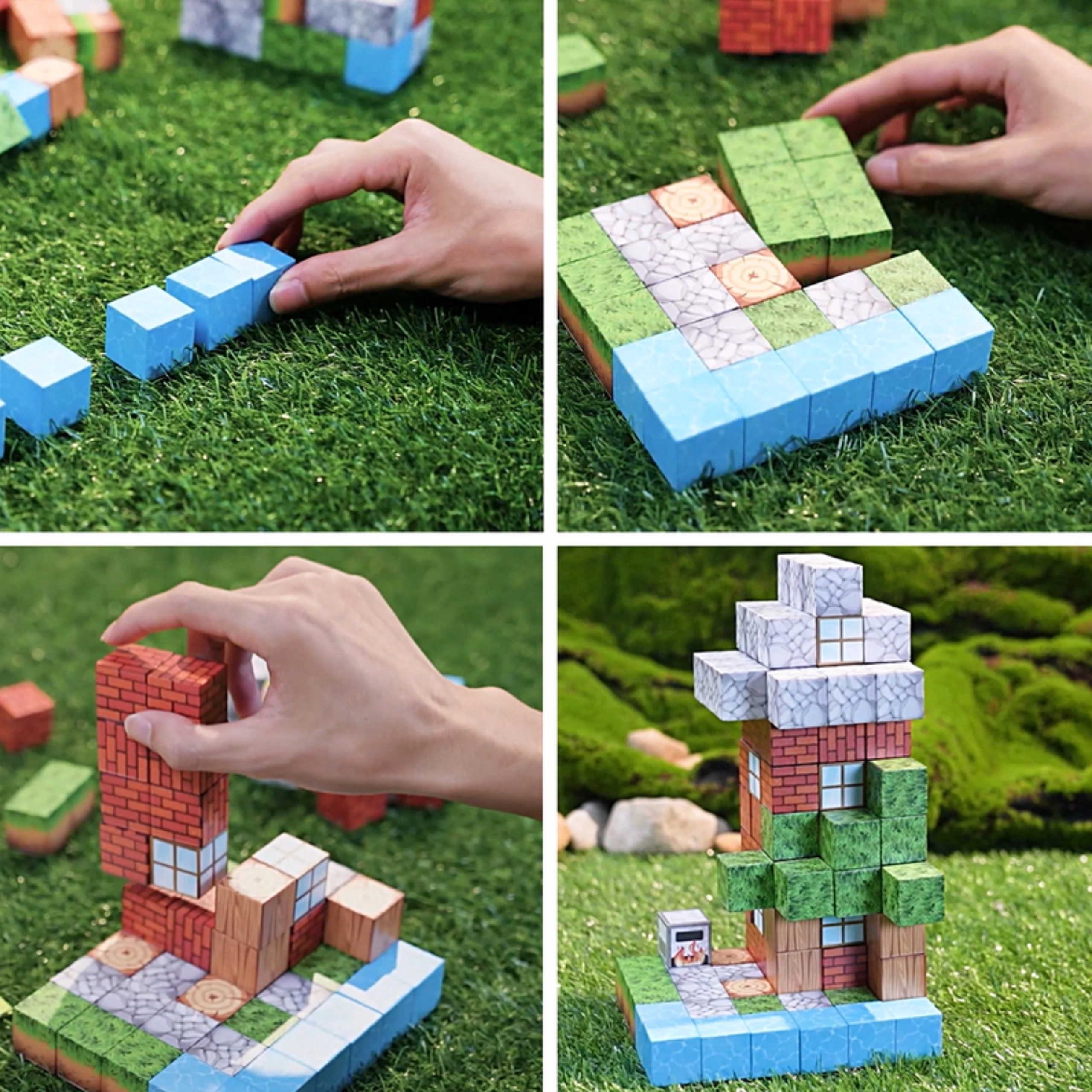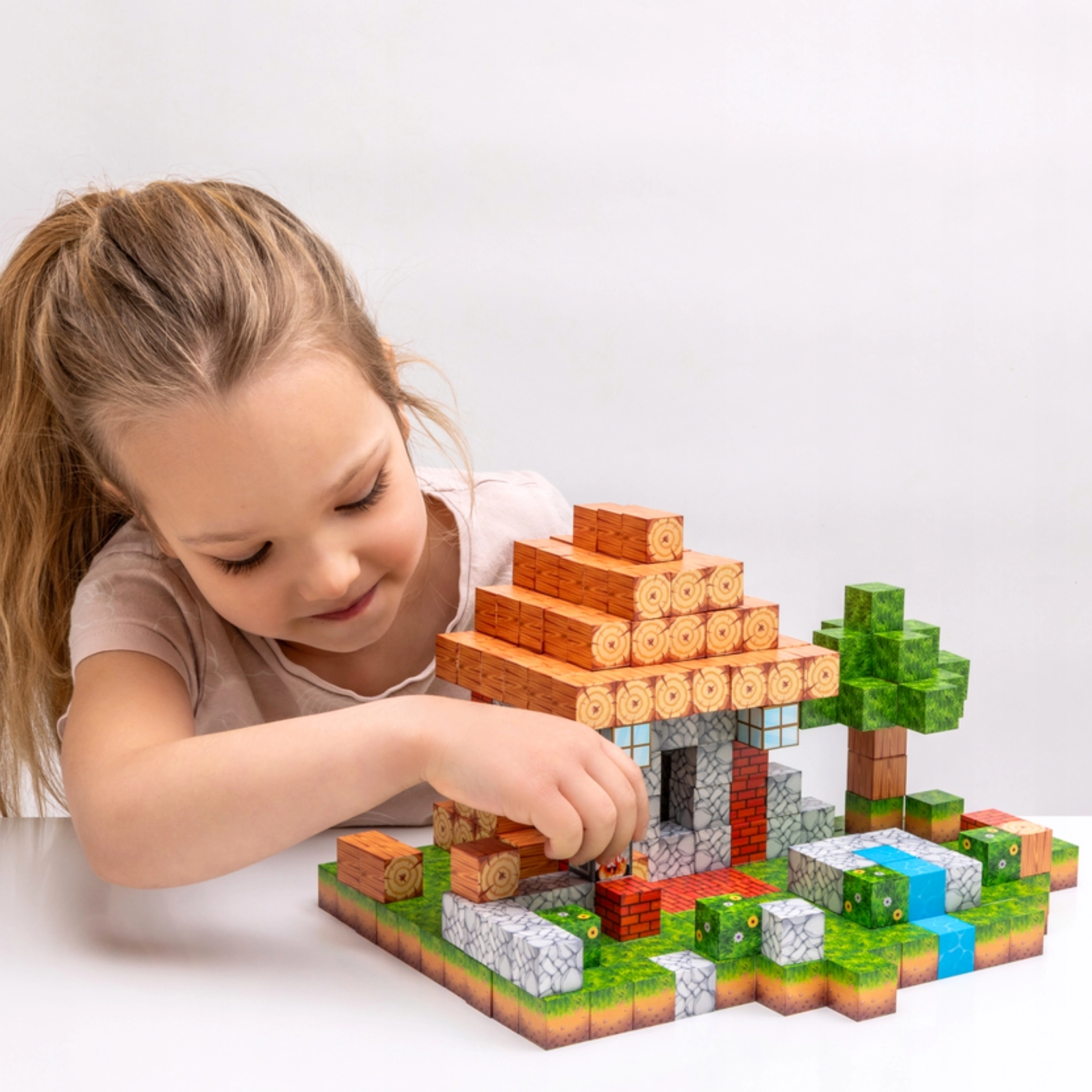 Открийте света на създаването с магнитните кубчета WOOPIE! Този голям комплект от 108 елемента в естествен стил позволява на децата да строят къщички, дървета, реки и други конструкции лесно и стабилно благодарение на вградените магнити. Играта подпомага креативността, логическото мислене и фината моторика – идеален подарък за малки строители.