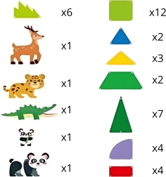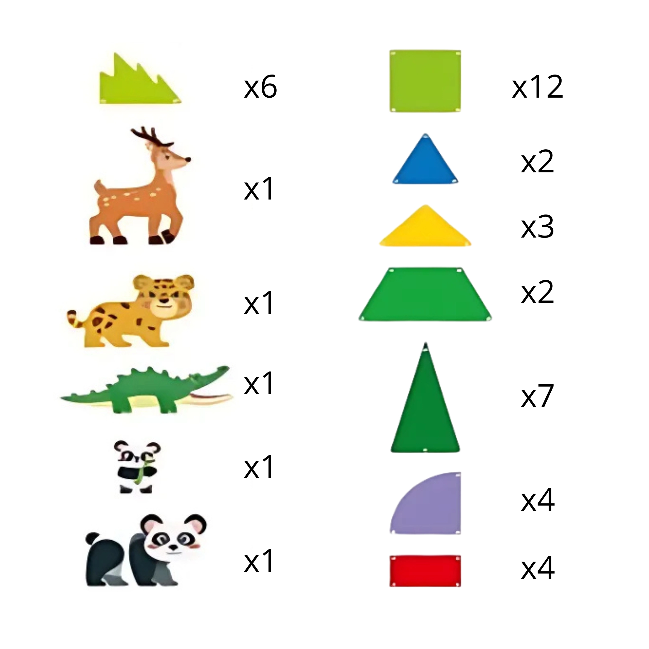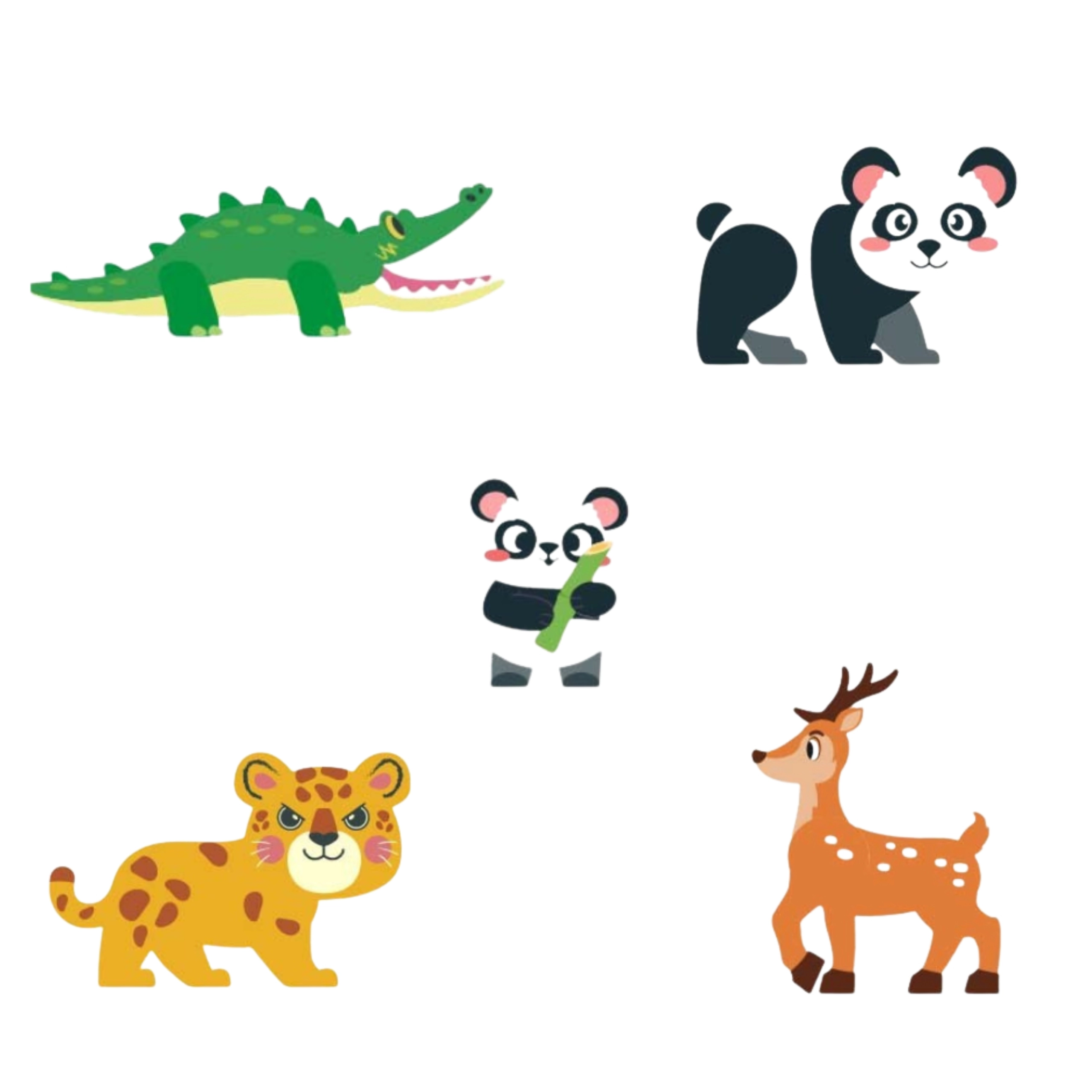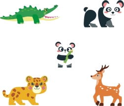 - Фигурки на животни: 2× панда, леопард, елен, крокодил
