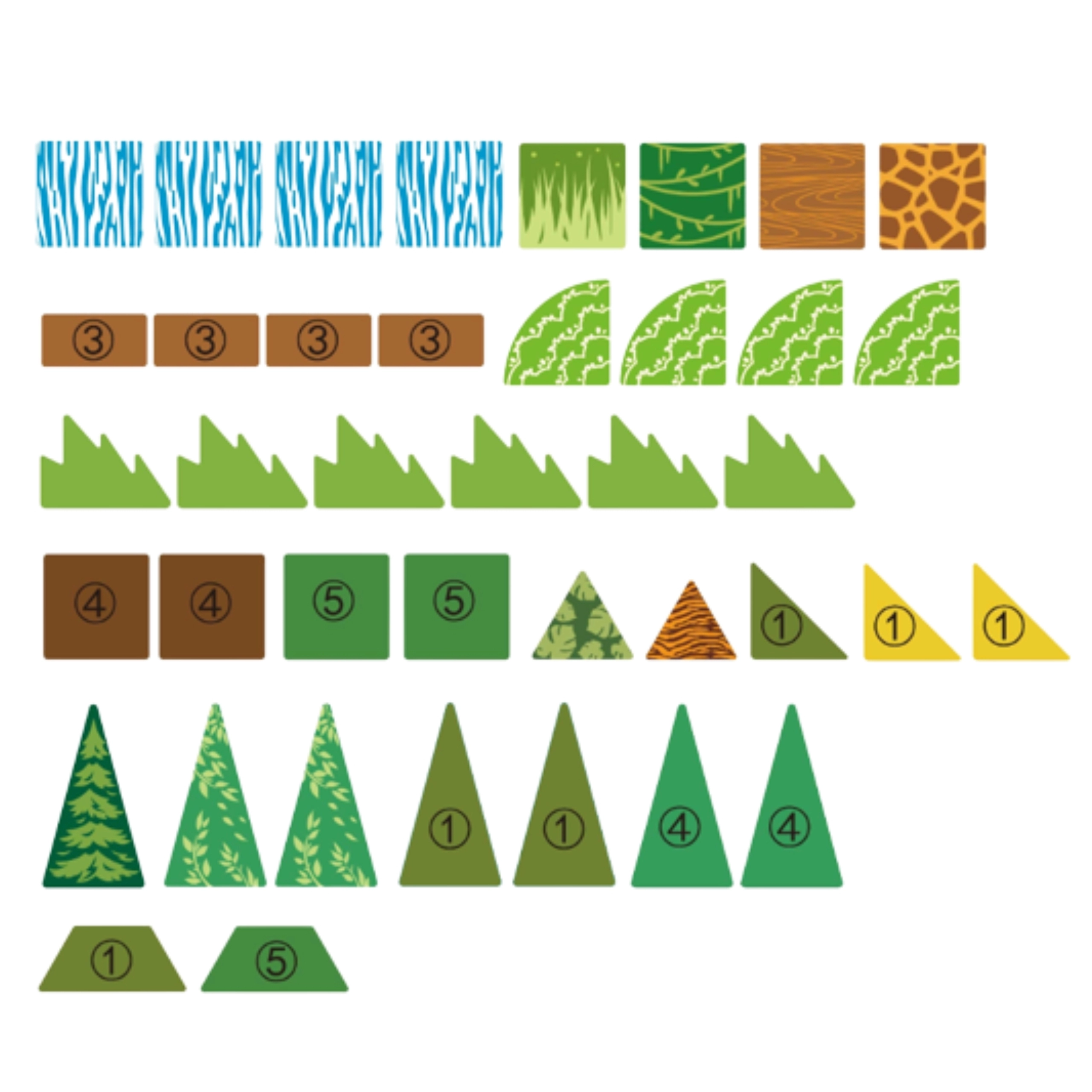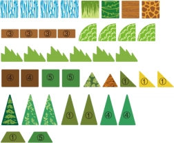 - 45 части в различни форми и цветове, включително водопад, арка, храсти и дървета