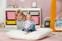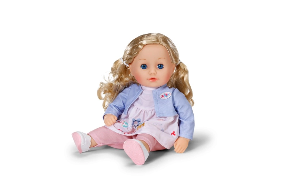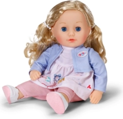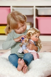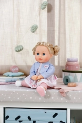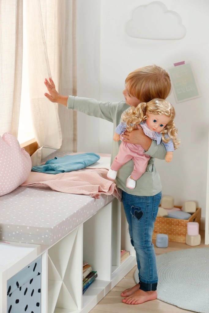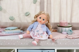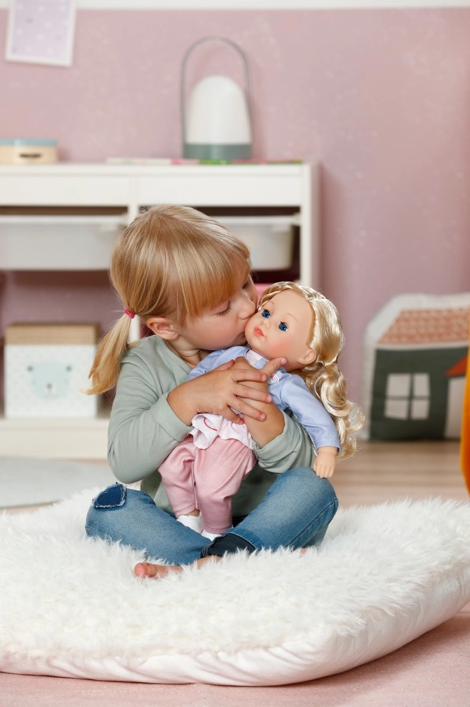 В комплекта има пълен сет дрехи: нежна рокля с леко палтенце, удобен клин и обувки. Благодарение на подвижните крайници куклата лесно се поставя седнала и се облича. Играта с куклата развива фината моторика, емпатията и въображението – идеален избор като първа кукла за най-малките.