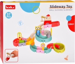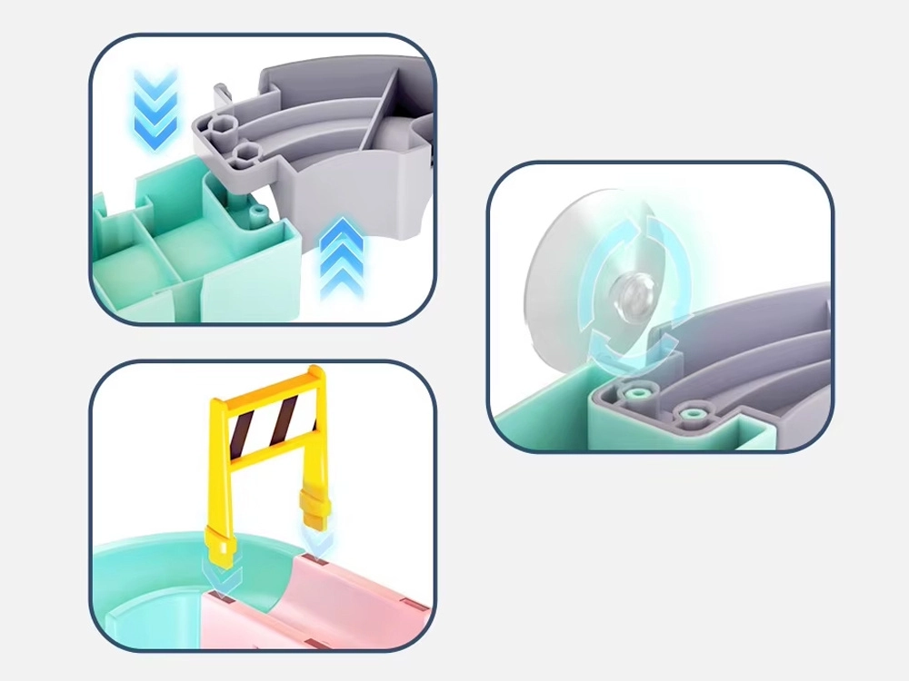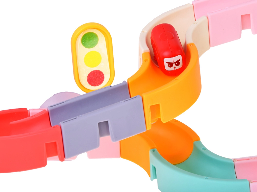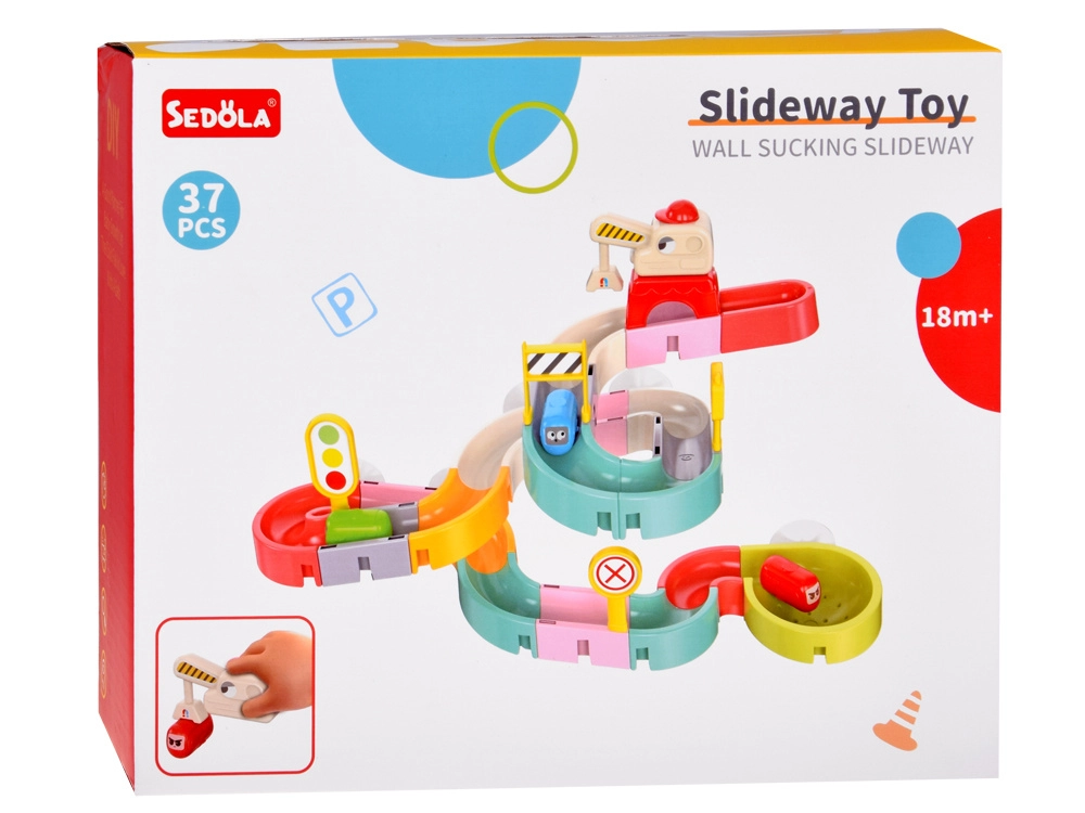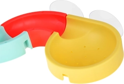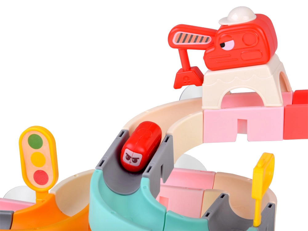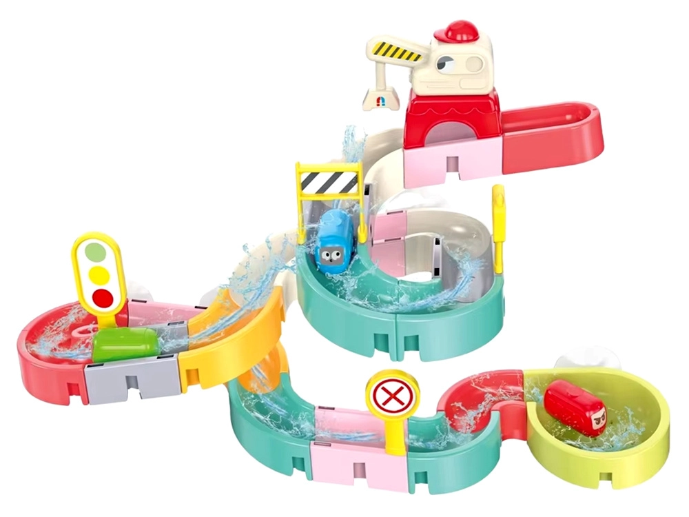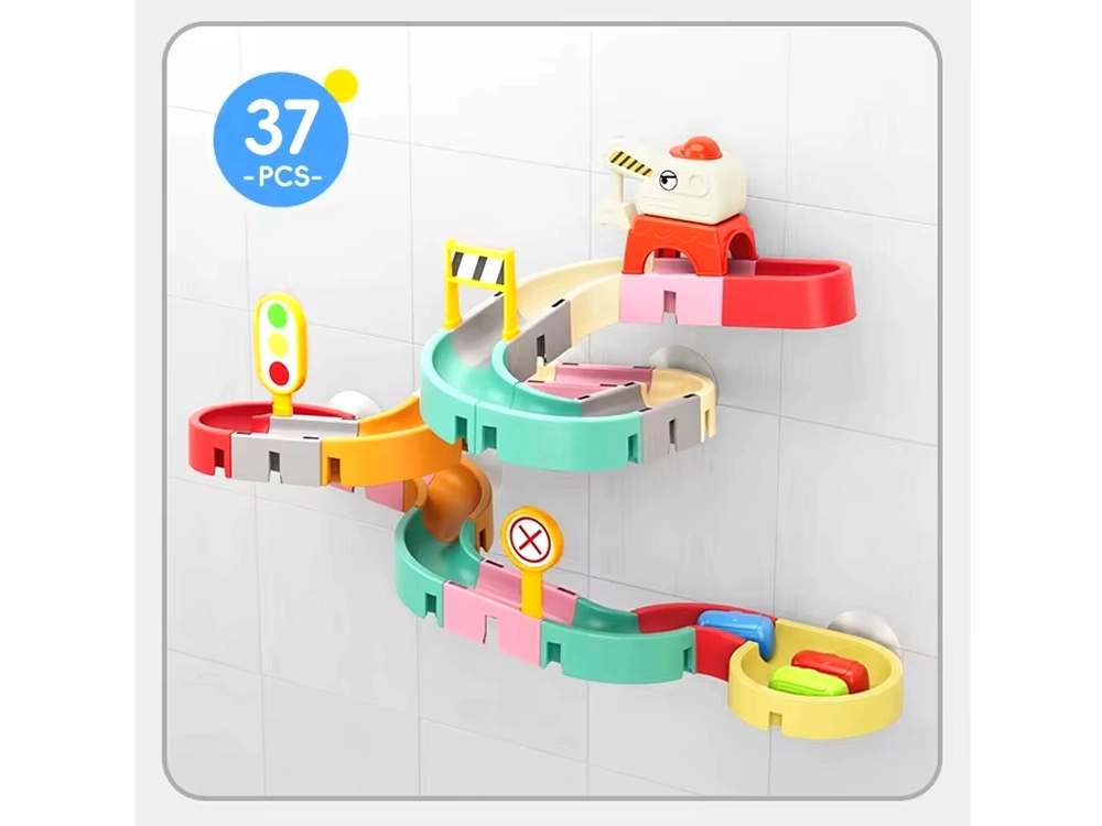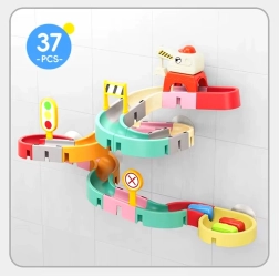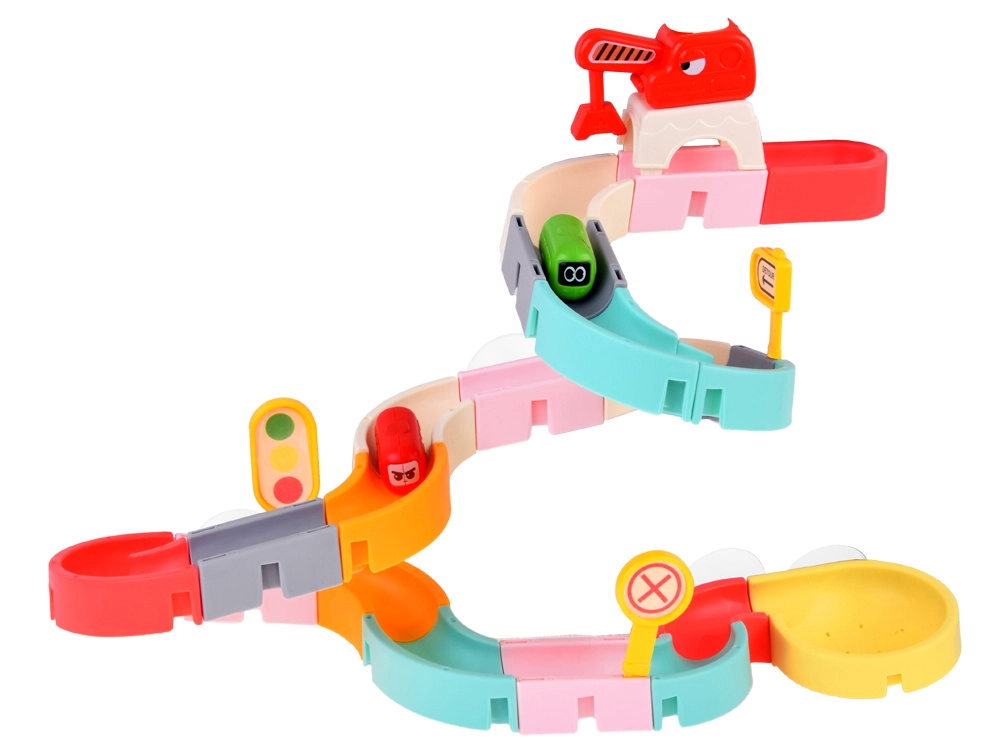 Този креативен комплект за баня впечатлява децата с цветни елементи, пътна тематика и водни ефекти. От 37 компонента сглобявате извити улеи и спускания, по които капсулните колички плават и се търкулват с помощта на водата. Силиконовите вендузи държат елементите здраво върху гладки повърхности, а завършекът със сито създава забавен воден душ.