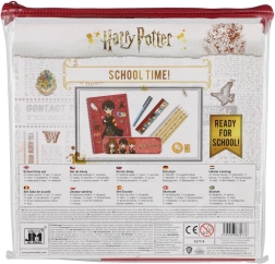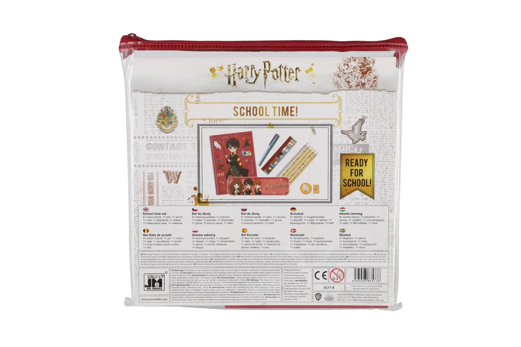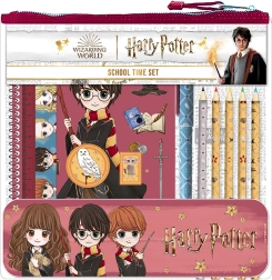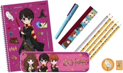 Стилен училищен комплект с мотив HARRY POTTER в прозрачен пластмасов несесер съдържа всичко, от което малкият (пред)ученик има нужда: несесер, линийка, молив, 4 цветни молива, гума, острилка, химикалка и бележник. Идеален за писане, рисуване и записки в училище и по време на път.