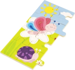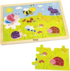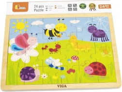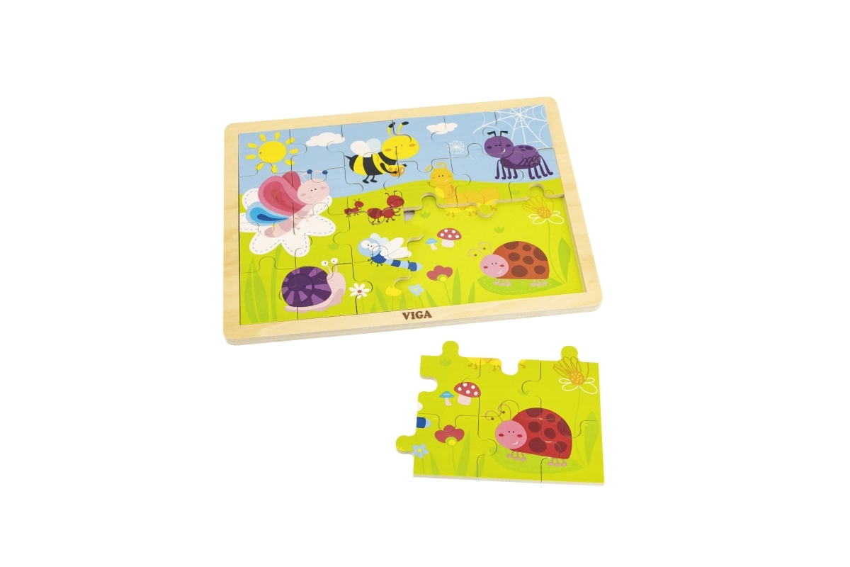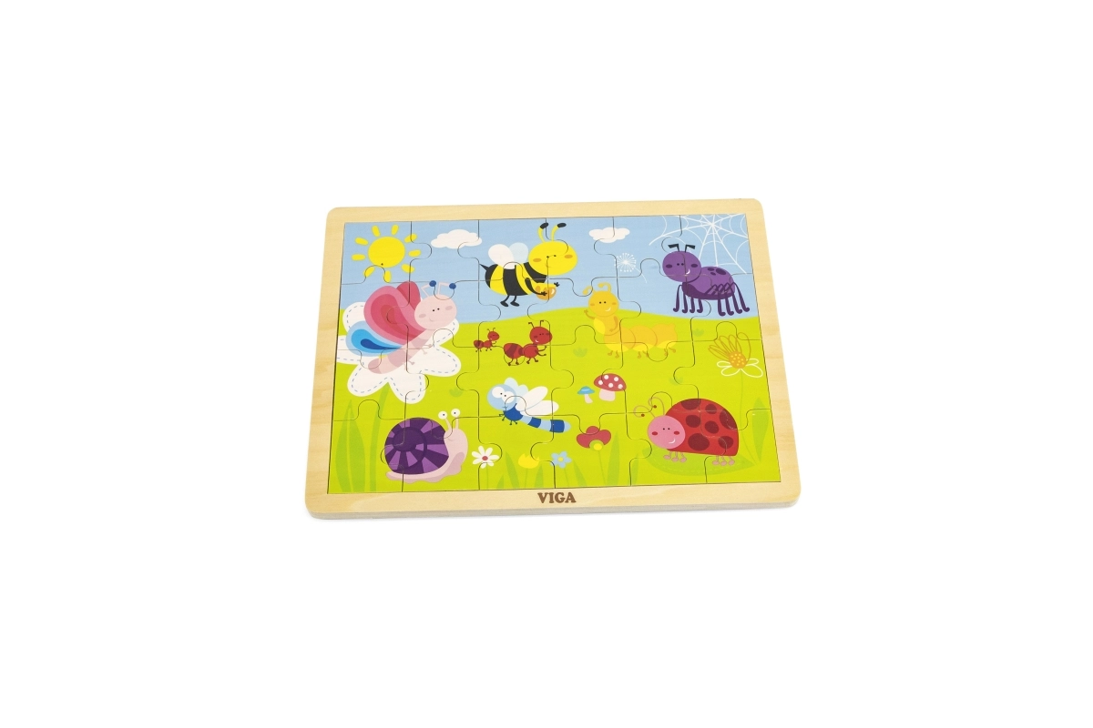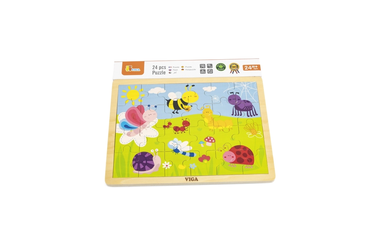 Открийте качествения дървен пъзел VIGA с илюстрация на ливада, пълна с цветни буболечки – пчеличка, пеперуда, калинка и охлюв. Подреждането на 24 здрави части в рамка насърчава търпението и концентрацията, докато децата разпознават форми, цветове и детайлите на приятелската илюстрация.