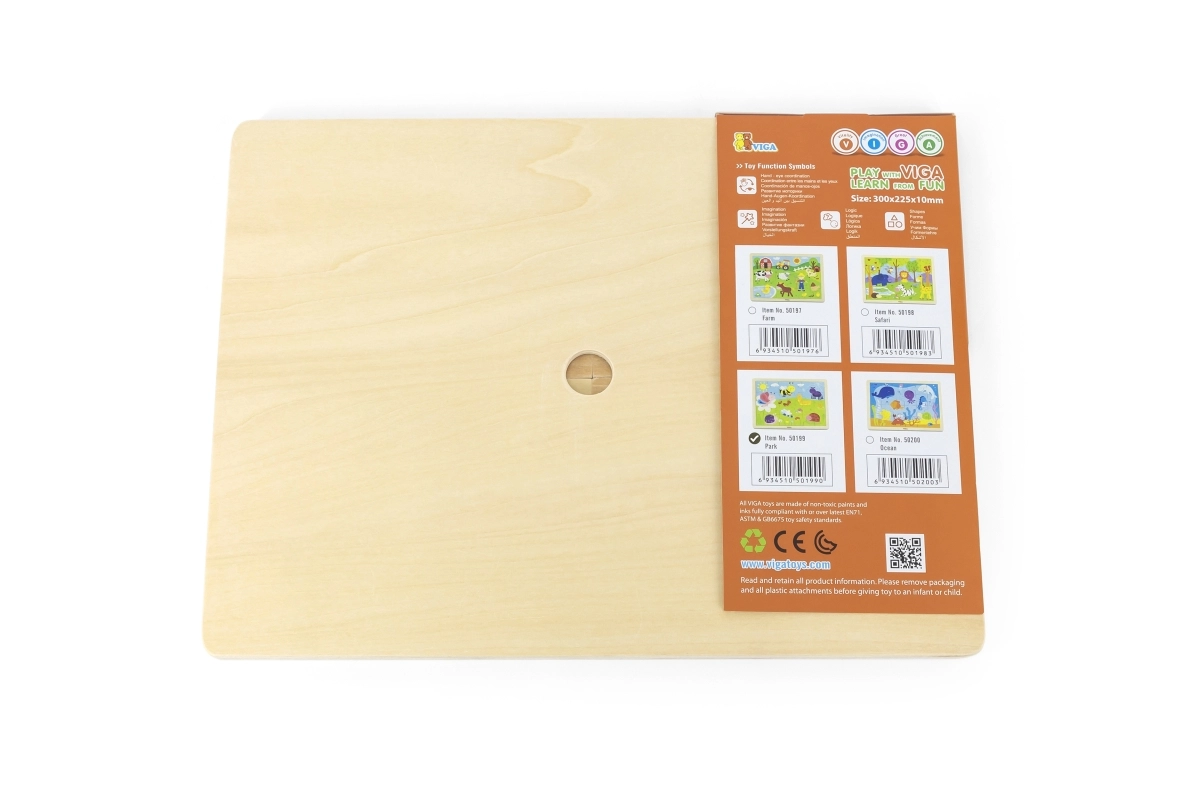 Дървената конструкция и гладко полирани ръбове осигуряват дълъг живот и безопасна игра. Идеален като първи „по-голям“ пъзел за малки подреждачи – у дома и в детската градина.