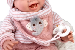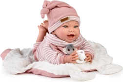 Утежняващият пълнеж в главичката и дупето (около 1 800 г) осигурява естествено отпускане на главичката и автентично усещане за грижа като при истинско бебе.