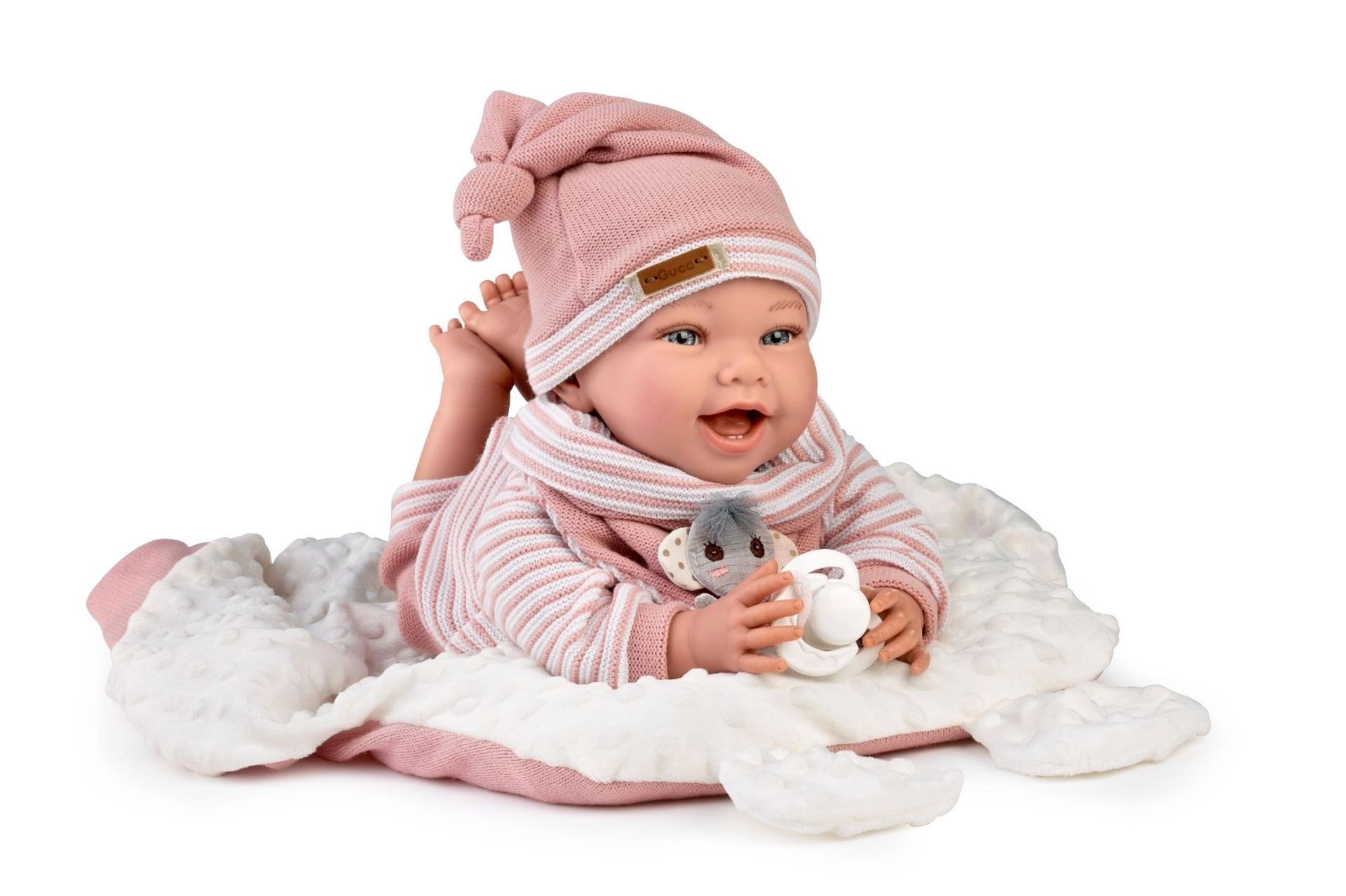 Куклата Guca Olivie е утежнено бебе без звук, което благодарение на ставно закрепените ръце и крака лесно седи и сменя пози. Специалното балансиране на главичката и дупето (около 1 800 г) осигурява автентично поведение в прегръдка – главичката трябва да се поддържа като при истинско бебе. Мекото текстилно тяло и реалистичните детайли насърчават емпатичната игра и грижата.