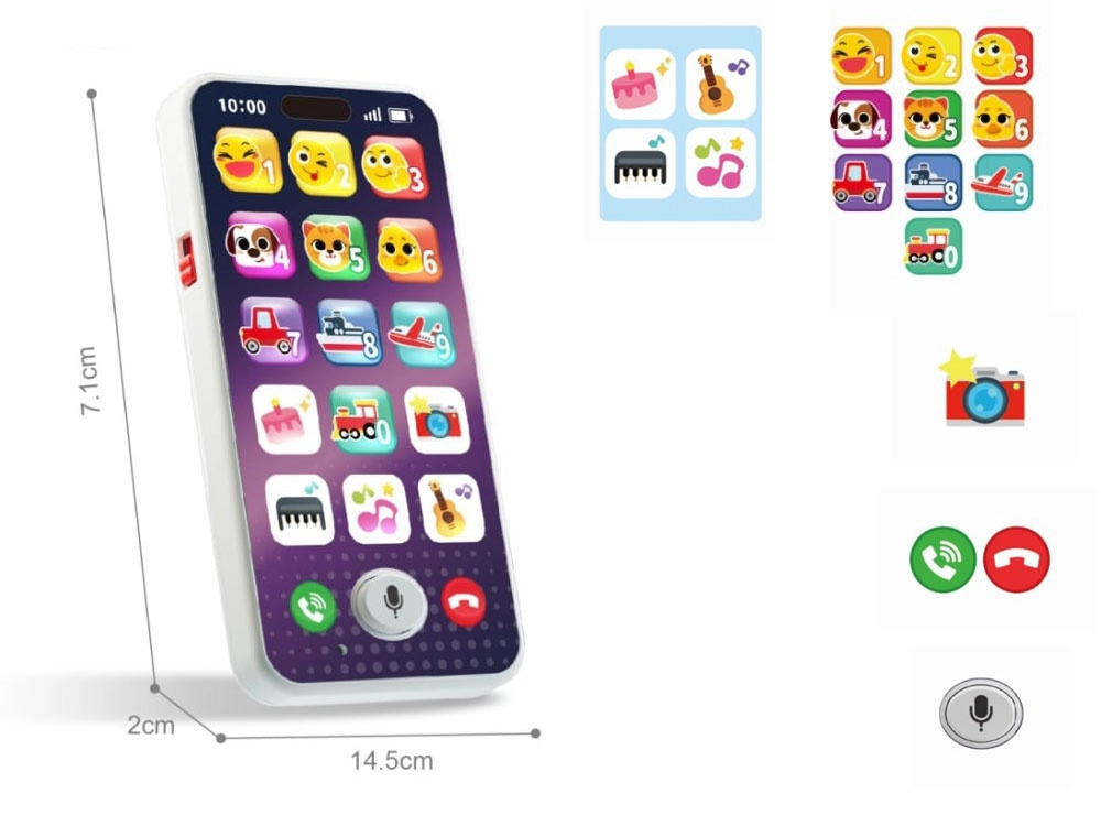 Интерактивният смартфон за деца съчетава забавление и учене в едно. Благодарение на бутоните 0–9 и тематичните икони децата упражняват числата, разпознаването на звуци и ритъм. Двойният звуков режим на всеки бутон поддържа играта разнообразна и стимулира развитието на слуха, речта и координацията.